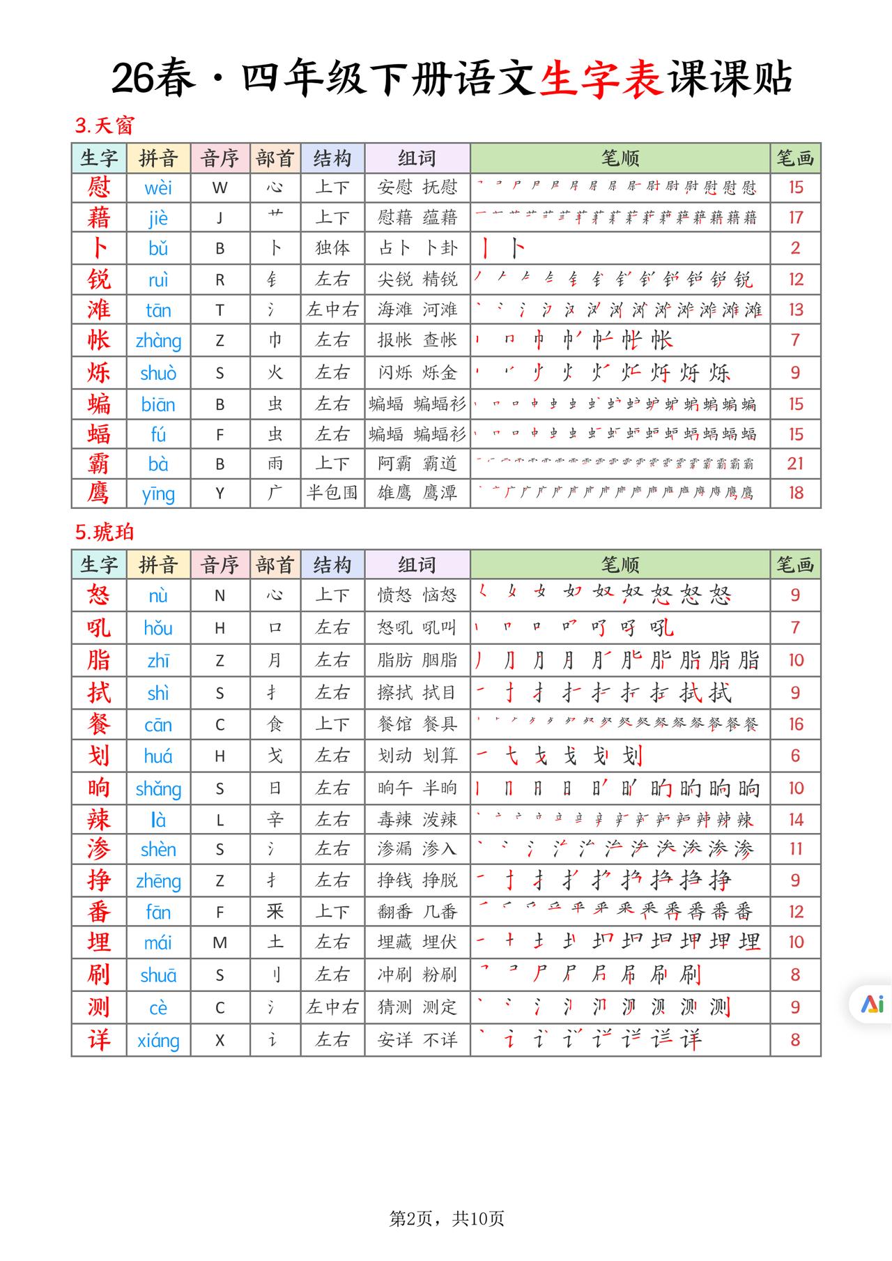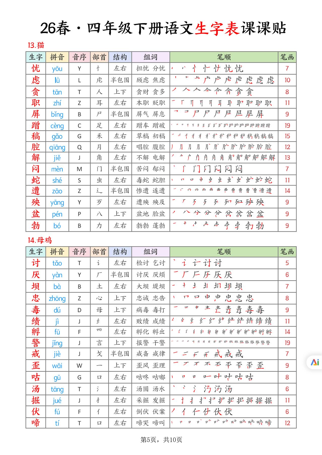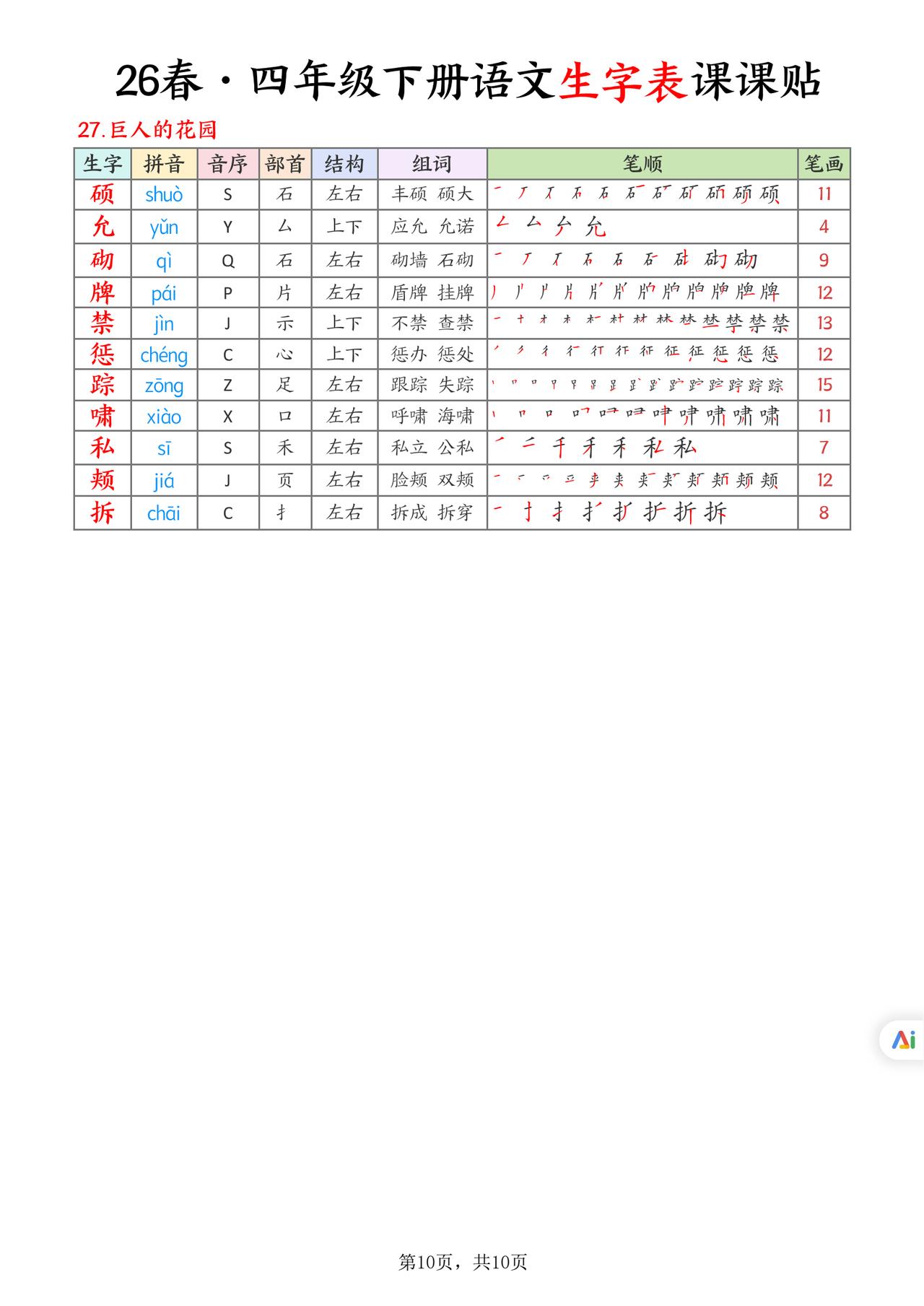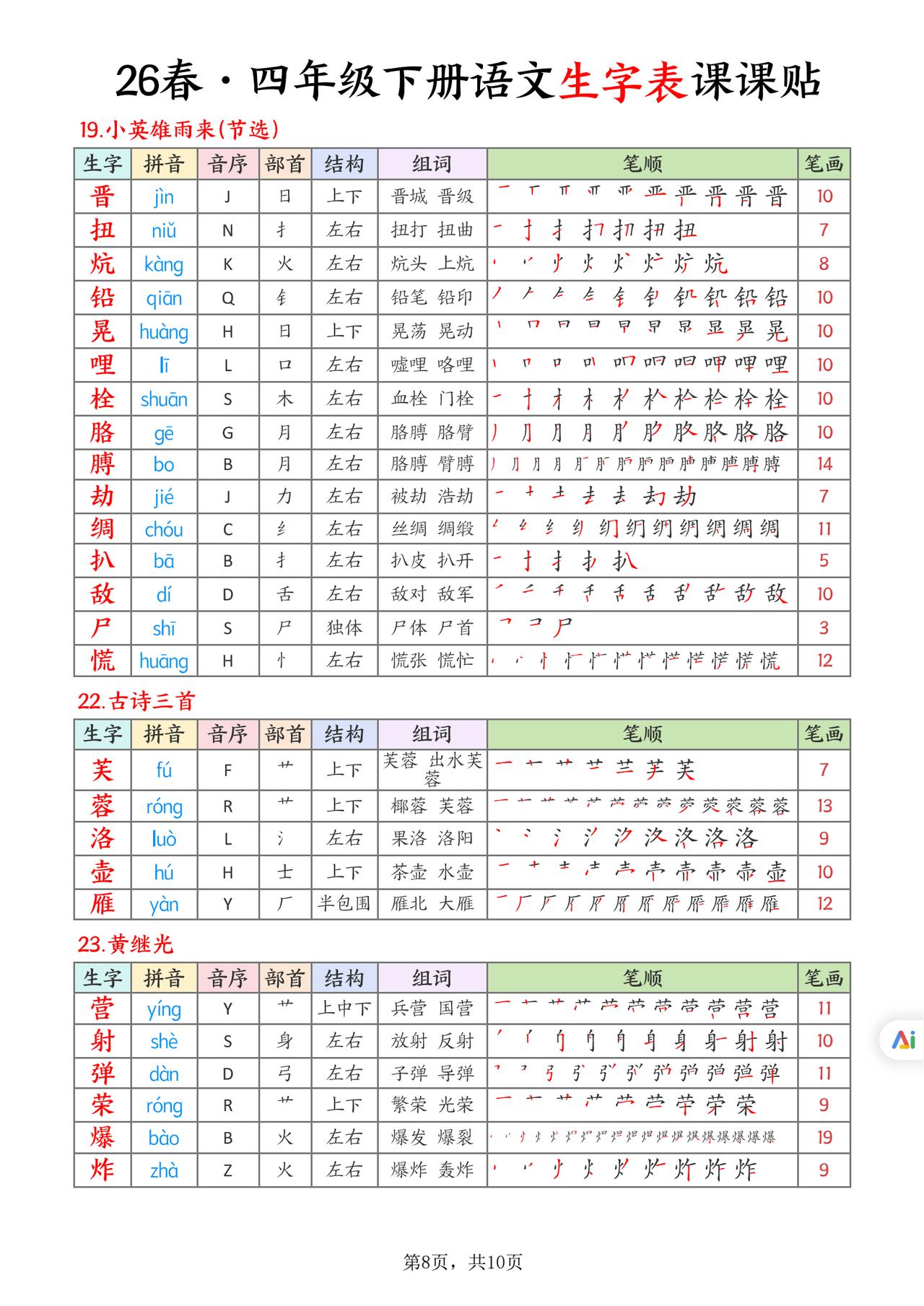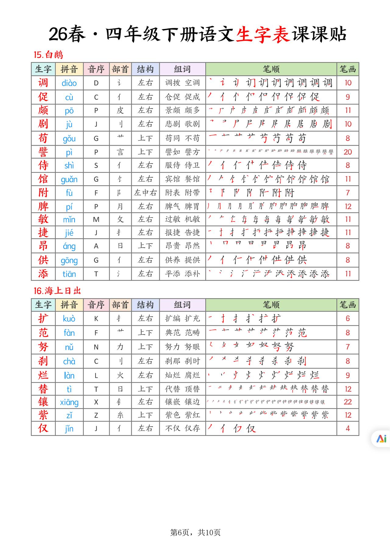 26春四年级下册语文,生字表课课贴10页,收藏备用