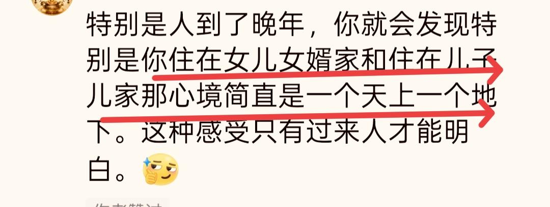 住女儿家里,总有一种寄人篱下的感觉,总觉得不是自己的家。但是住儿子家,就觉得天经地义,是自己的家。