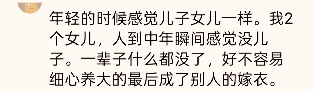 年轻的时候感觉儿子女儿一样。我2个女儿,人到中年瞬间感觉没儿子。一辈子什么都没了,好不容易细心养大的最后成了别人的嫁衣。