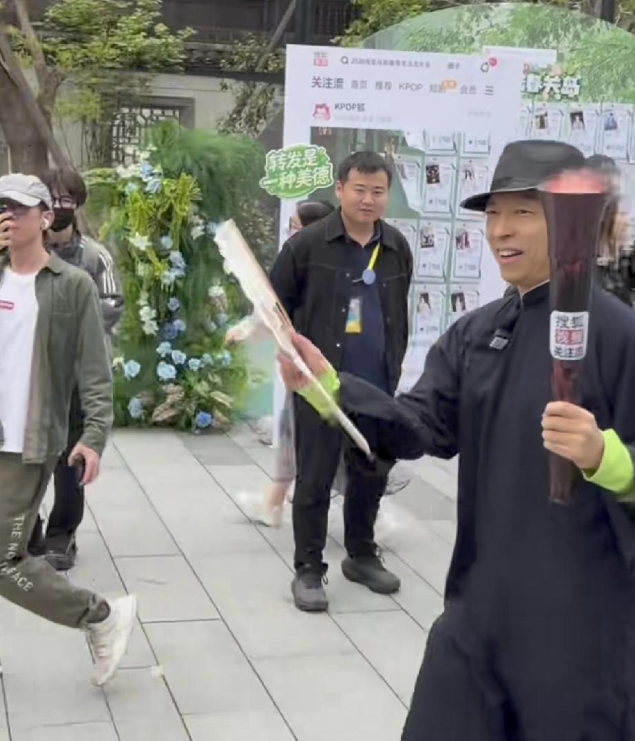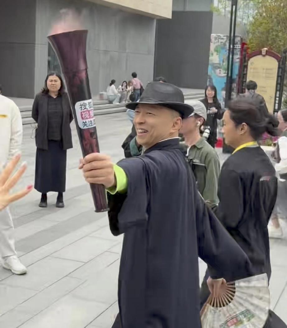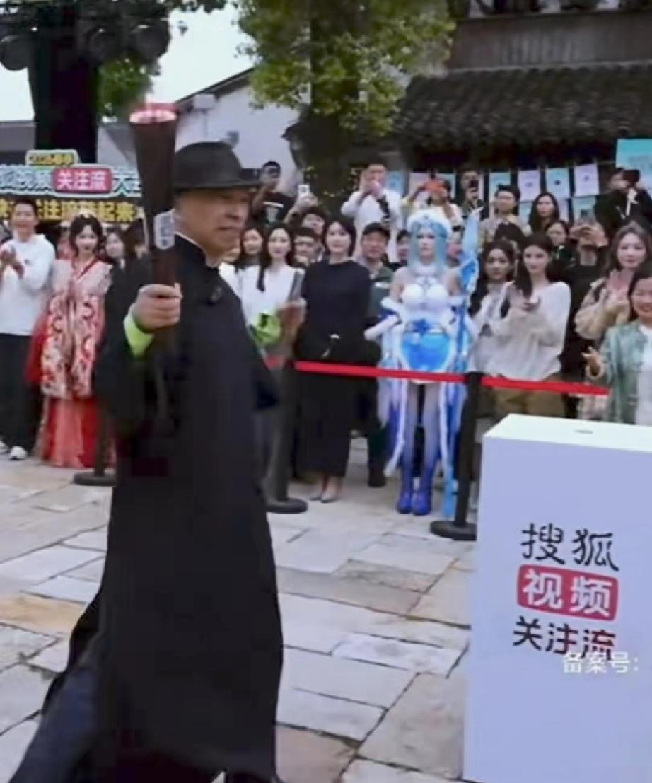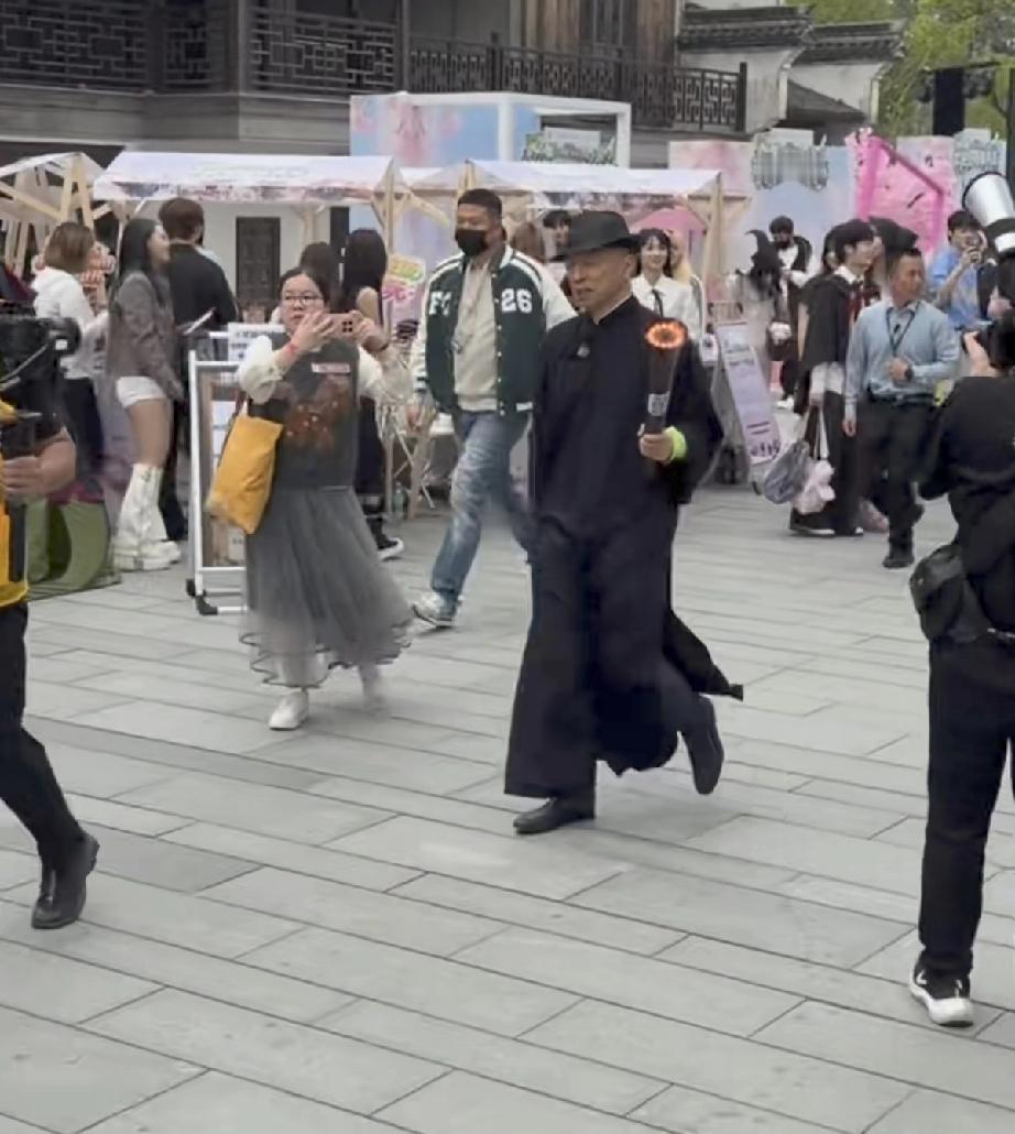 张朝阳穿了长衫,戴着礼帽手持扇子,从一艘小船上登陆,到了现场,他手持火炬走路很快,一边走一边笑,近距离下他真的有点坏坏的帅。