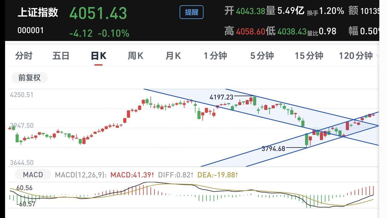 看下面的截图2,这是上证指数日K线图,从4197点到3794点,是一个下跌的过程,从3794点到现在,是一个上涨的过程,这个上涨是在一个上涨通道内进行的,只要能够保持在这个上涨通道内运行,上涨的过程都没有结束,只有下跌,跌破了这个上涨通道的下轨线,这个上涨过程才有可能结束,下周主要是观察这个上涨通道下轨线的得失。
