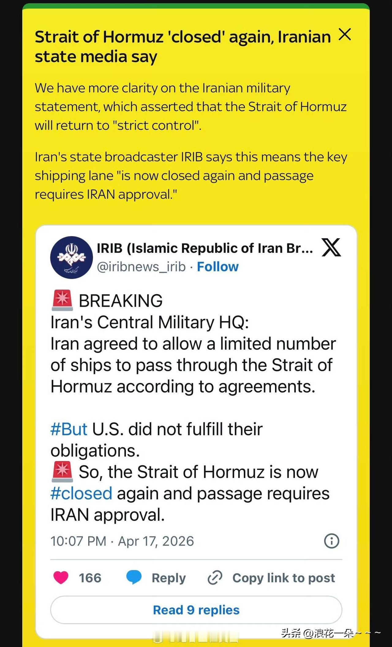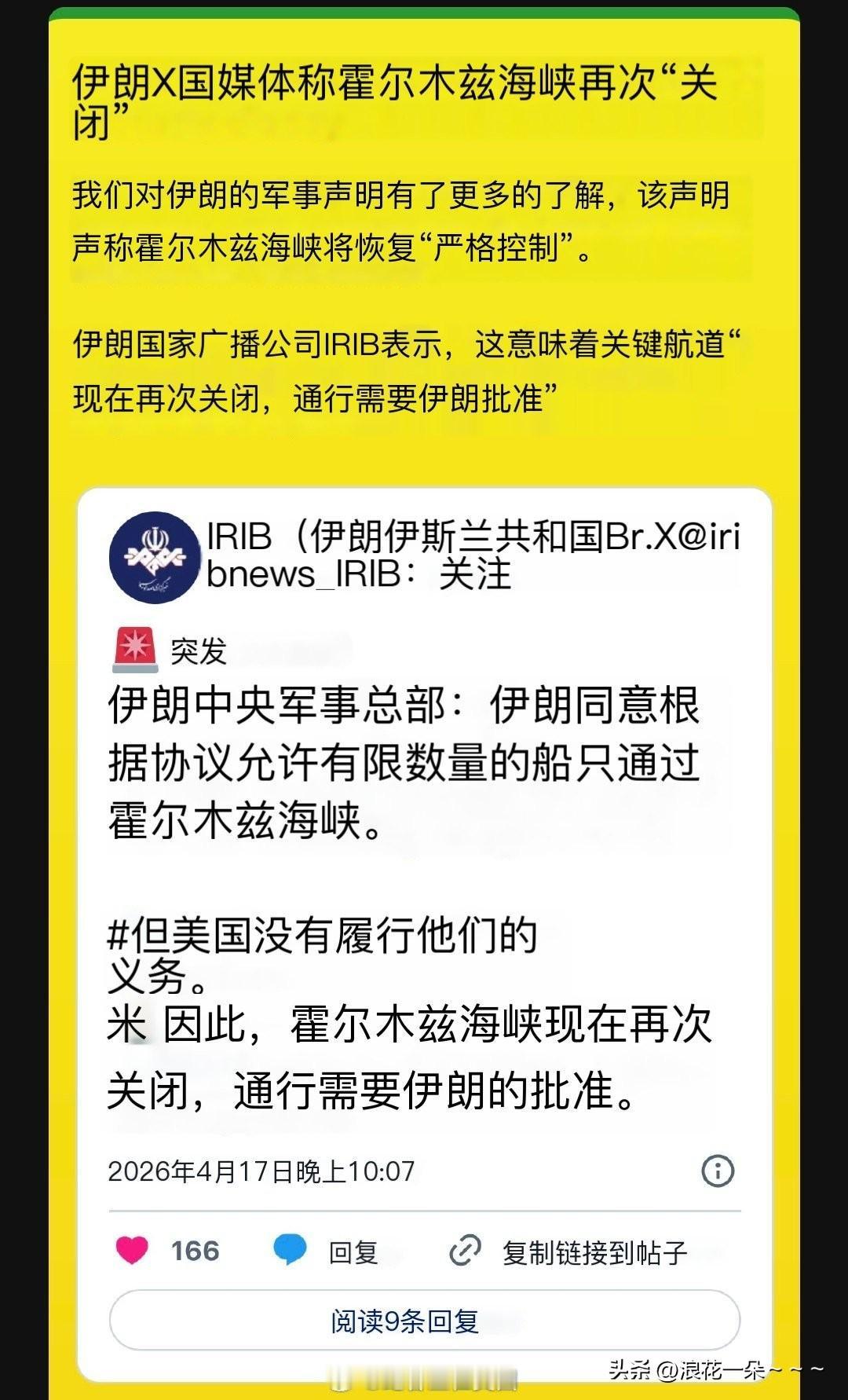 真是计划不如变化快?伊朗国家电视台IRIB:伊朗军方发声明,由于美国拒绝解除对伊朗海湾港口的海上封锁,霍尔木兹海峡已“恢复到此前的状态”。这意味着霍尔木兹海峡航运通道“已经再次关闭,所有通行都需要获得伊朗的批准”。