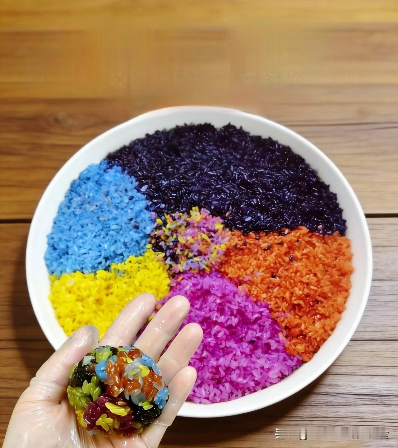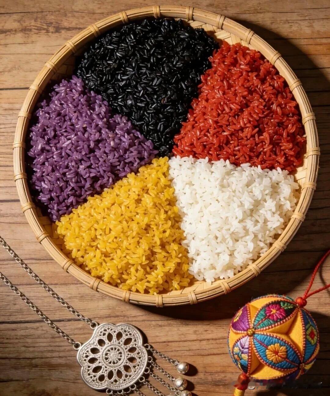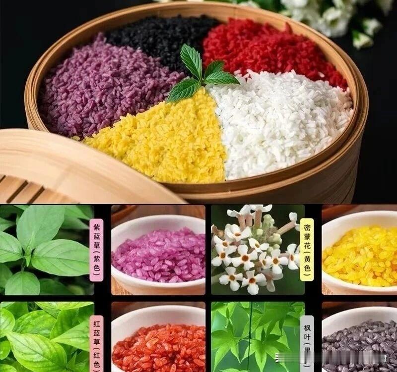 答案很简单:五色糯米饭是广西“三月三”、清明等节日的标志性美食,因黑、红、黄、紫、白五色得名。