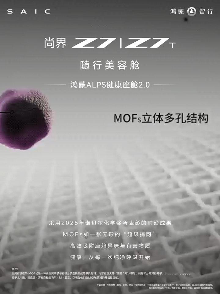 鸿蒙ALPS健康座舱2.0:采用2025年诺贝尔化学奖所表彰的前沿成果MOFs材料,以“物理吸附+化学降解”双重机制,高效吸附并降解有害物质,持久保持座舱空气纯净健康。