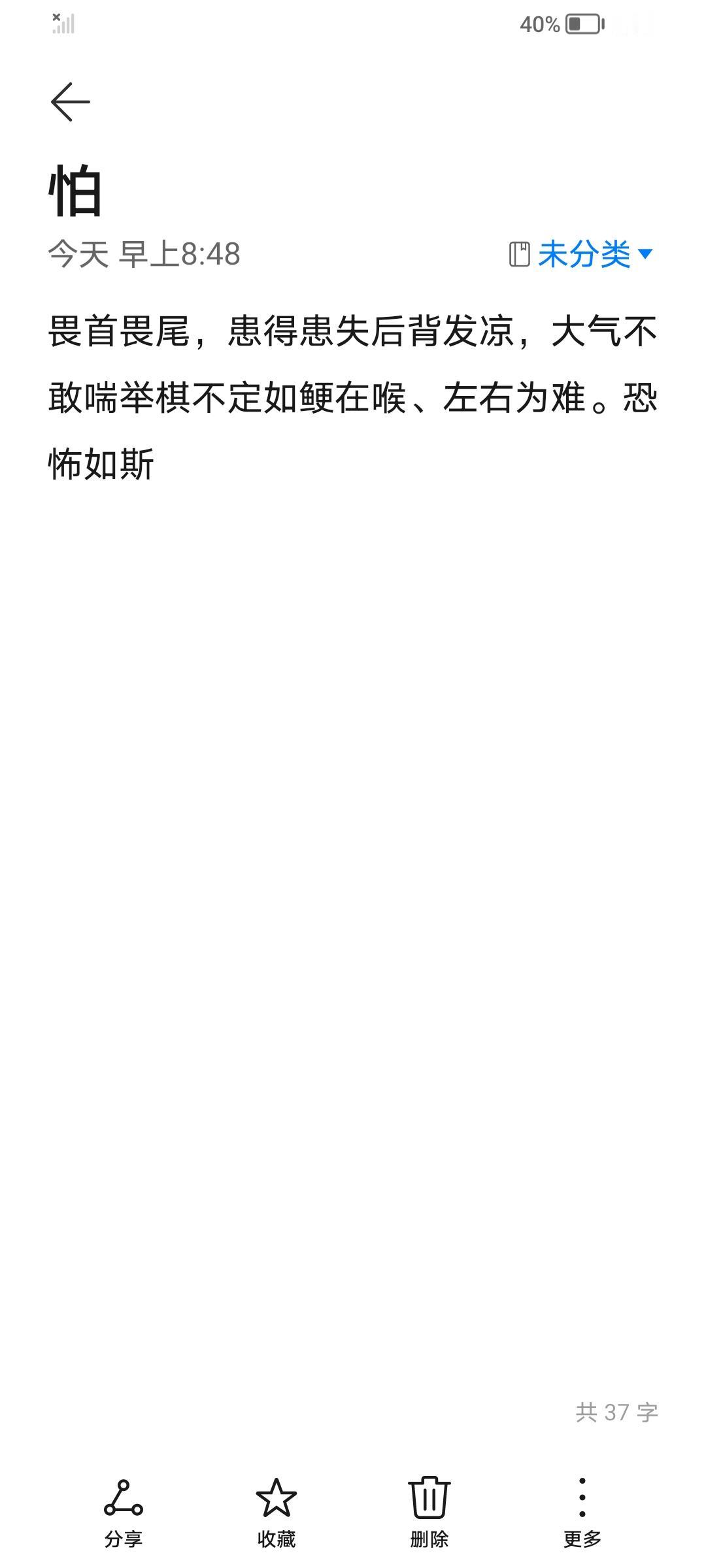 如何收集词语,助力写作呢?我每次阅读文章后,喜欢把文章中的好词语复制粘贴到备忘录里,像截图那样,先定个标题,比如:怕,把怕相关的词语统统放进里面去,以后写文章时,遇到要表达怕的意思时,只要在备忘录里搜索“怕”,相关的词语立马显示出来了。