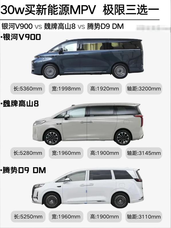 预算30w左右,想入手一台高性价比新能源MPV,纠结到无从下手?不用慌!今天聚焦3台热门爆款——银河V900、魏牌高山8、腾势D9 DM,从核心配置、续航表现、空间实力全方位解析,干货拉满,帮你精准锁定适配款,闭眼选不踩坑👇