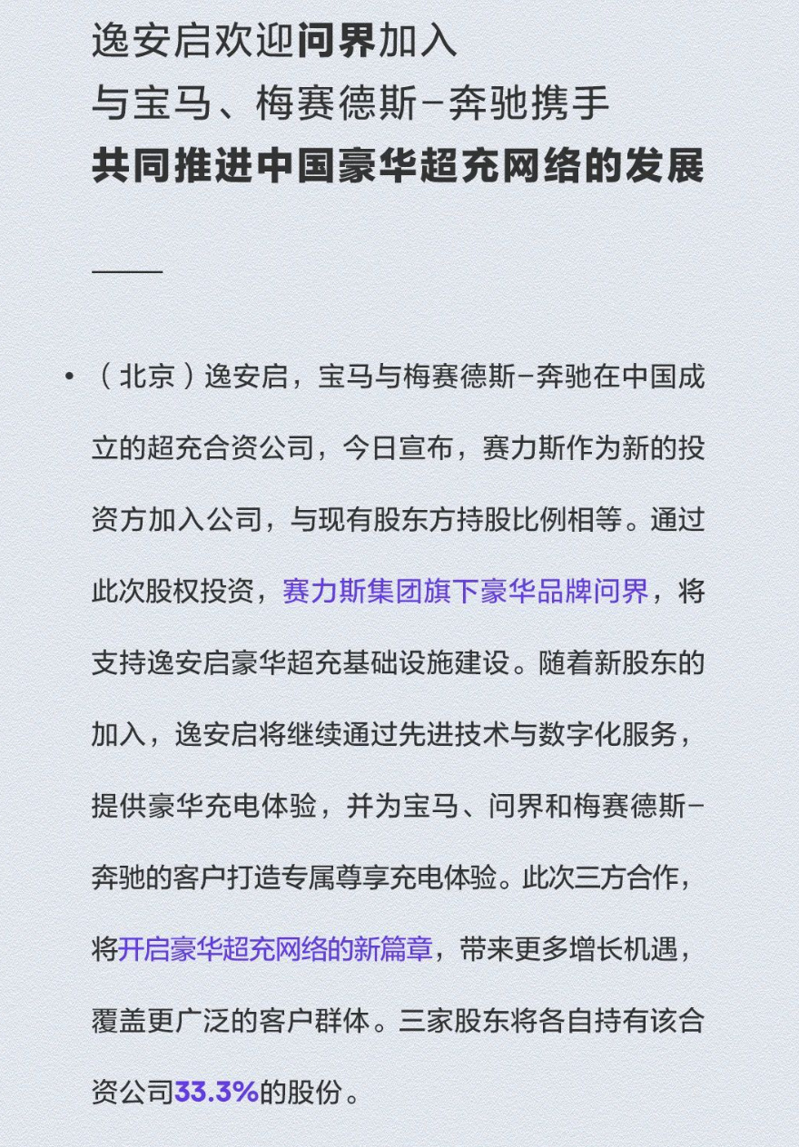 问界正式入股了宝马和奔驰的超充合资公司“逸安启”,三家每人各占33.3%的股份。