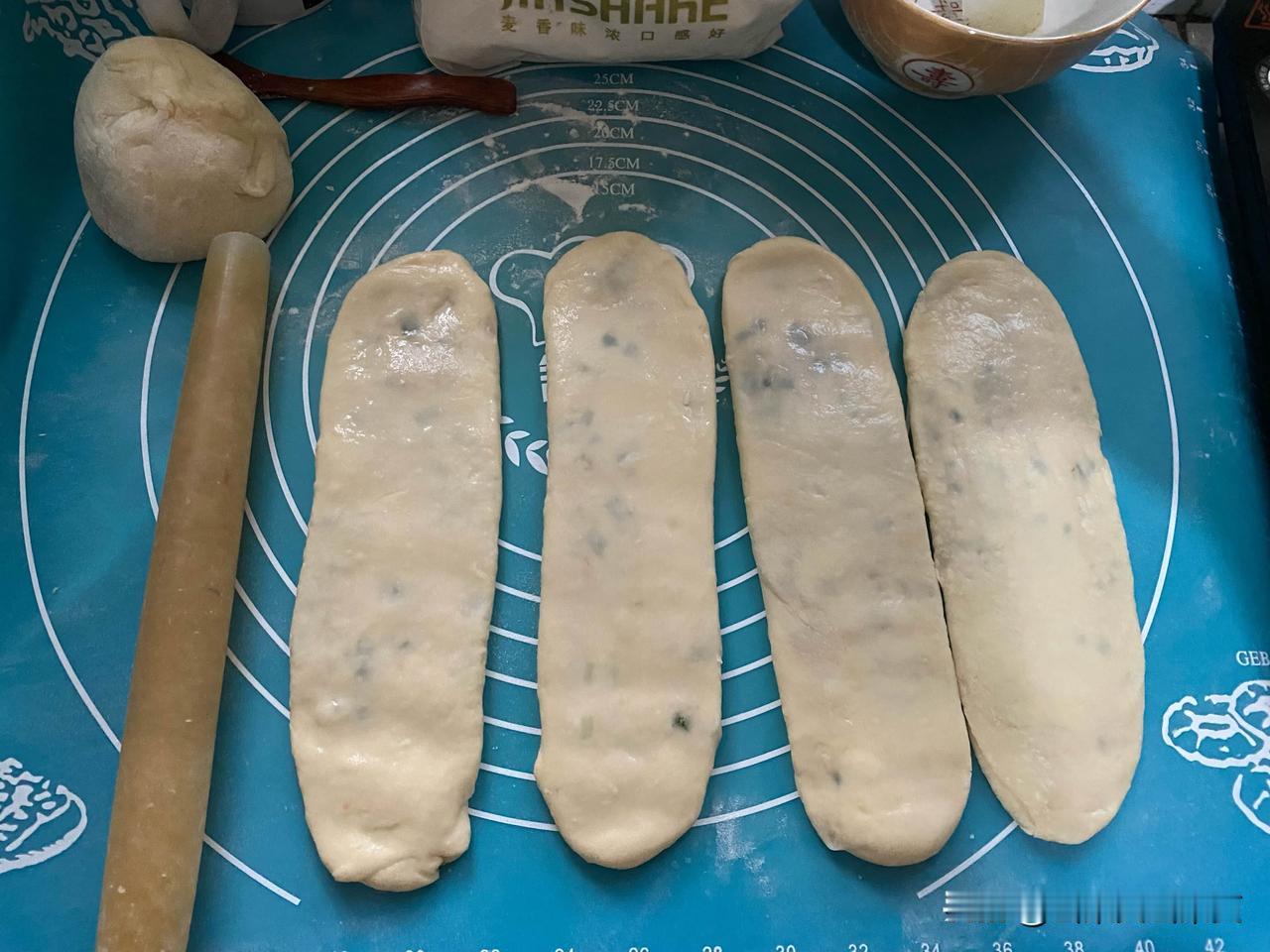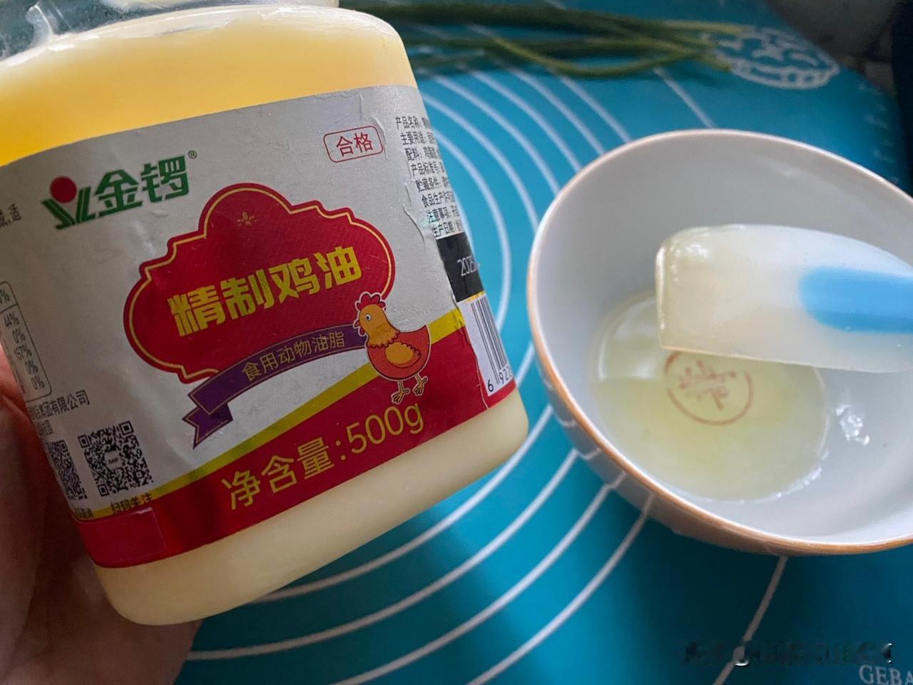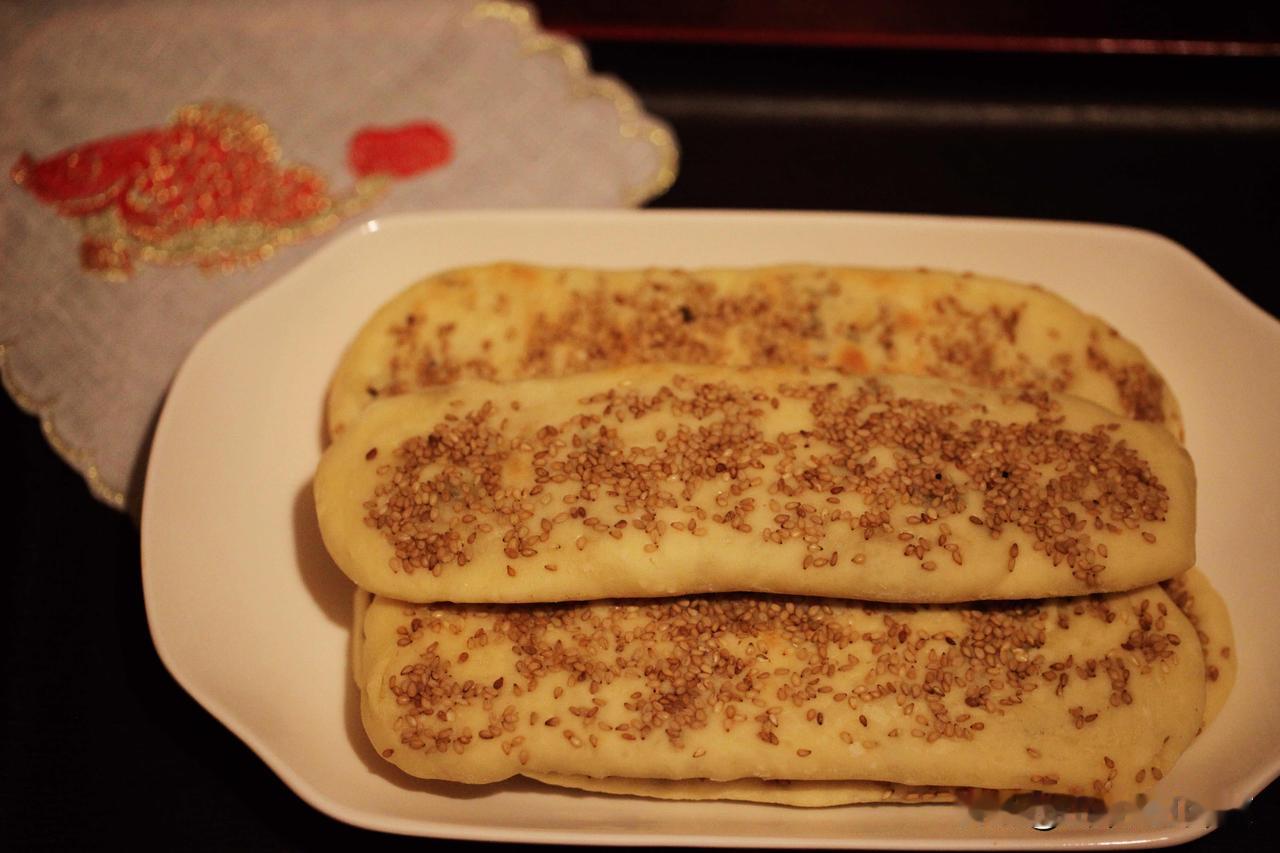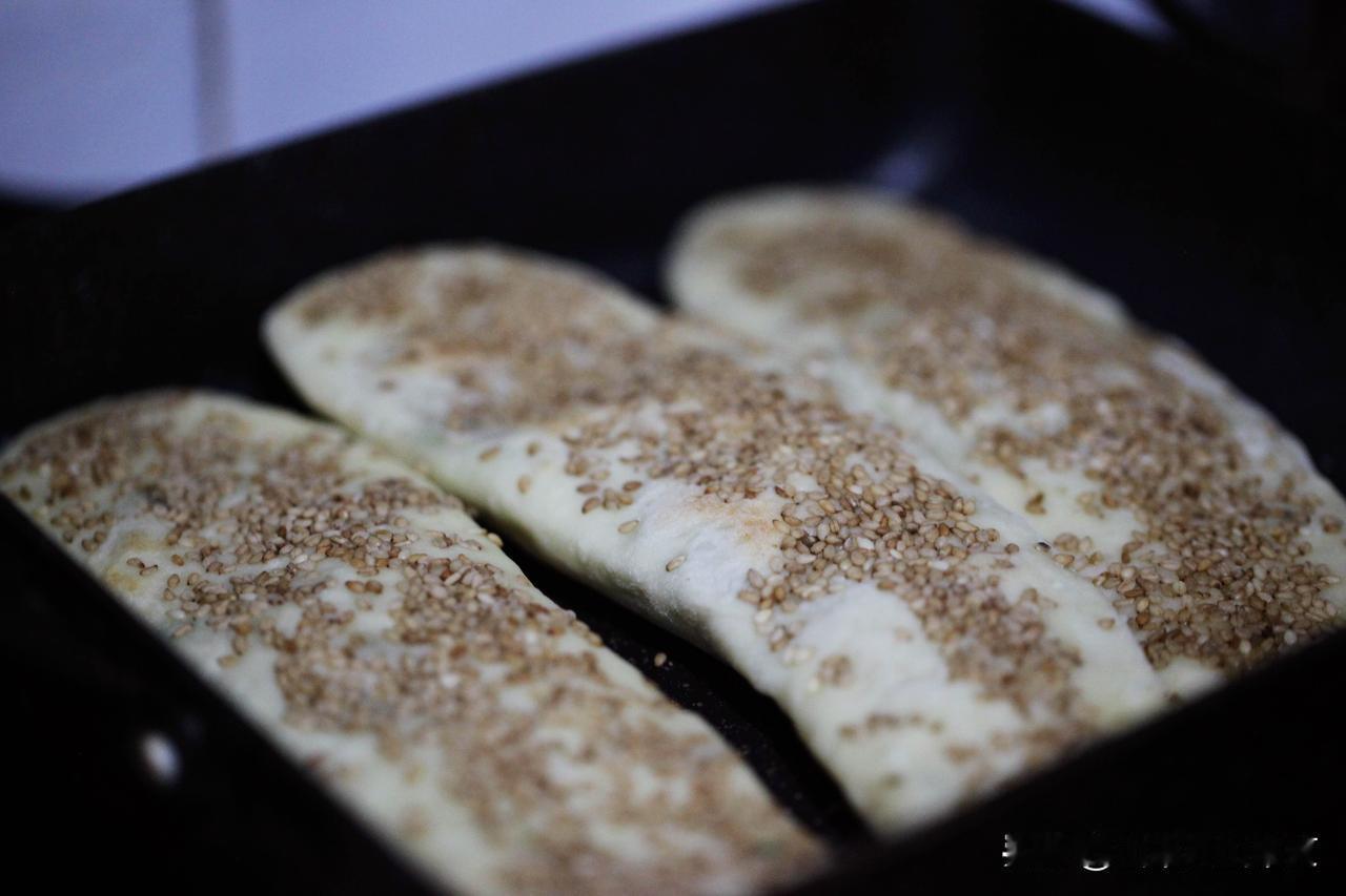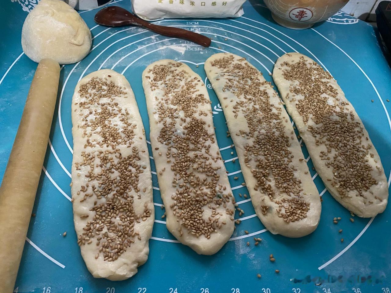 图二图三是葱油,是刷在面饼上的,用的鸡油和椒盐混合,混合时加少量面粉和葱花。六个面剂子擀成牛舌状刷上葱油再卷起来再擀成牛舌状,再在一面刷上少量水,撒上白芝麻,用擀面杖压实防止芝麻脱落。最后我是用平底锅电磁炉小火(300瓦和100瓦切换)烙的,先烙有芝麻的一面,盖上锅盖,不时观察即可[尬笑]