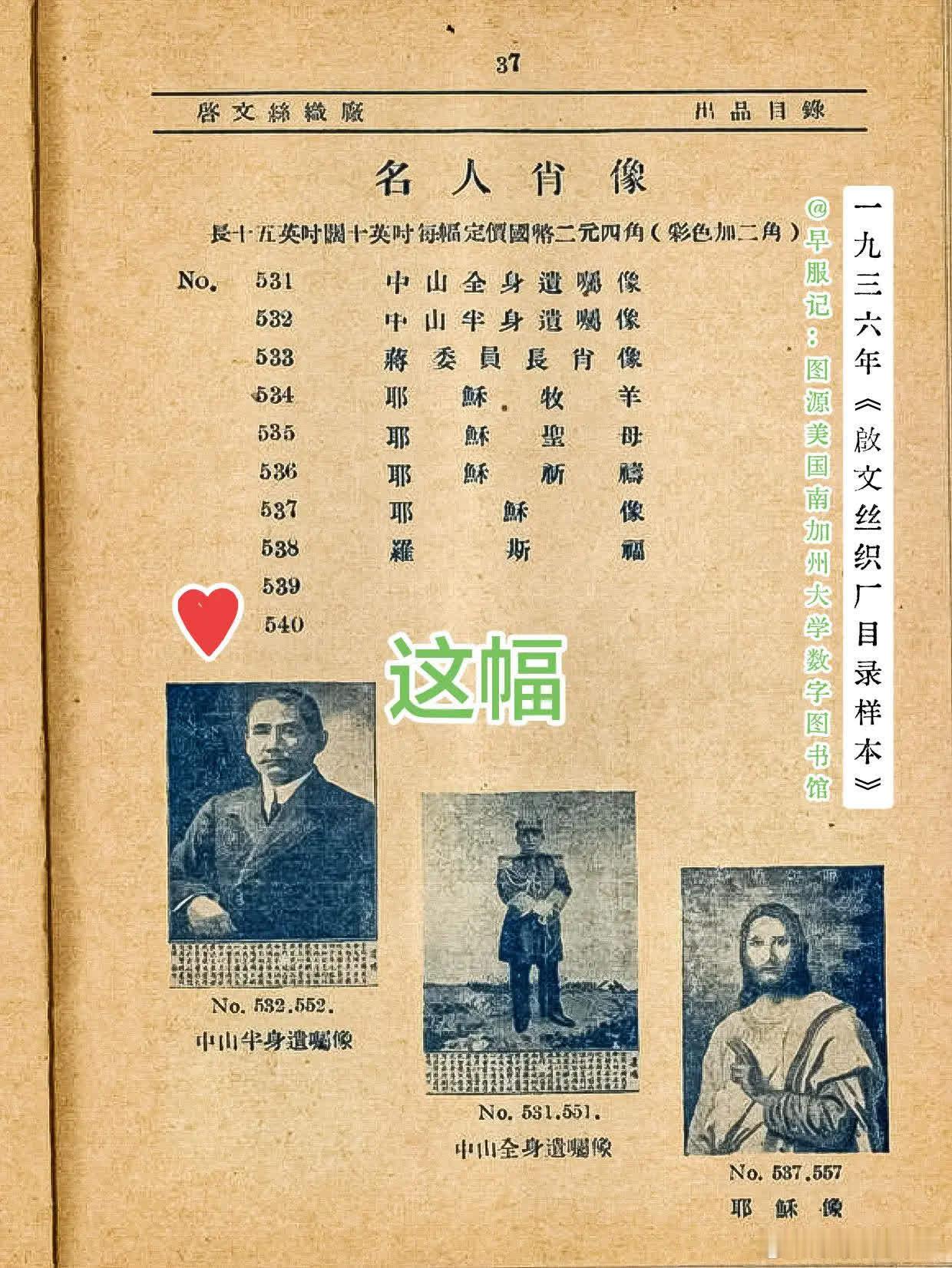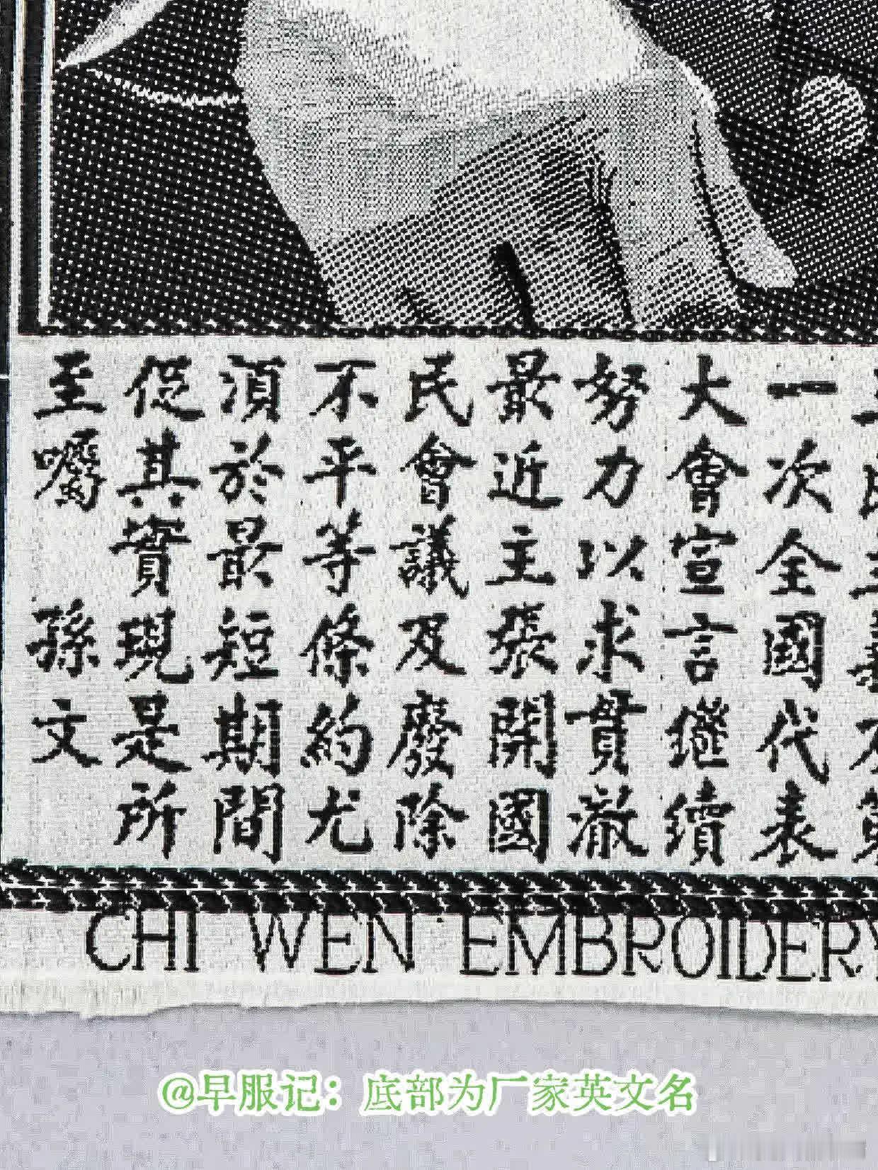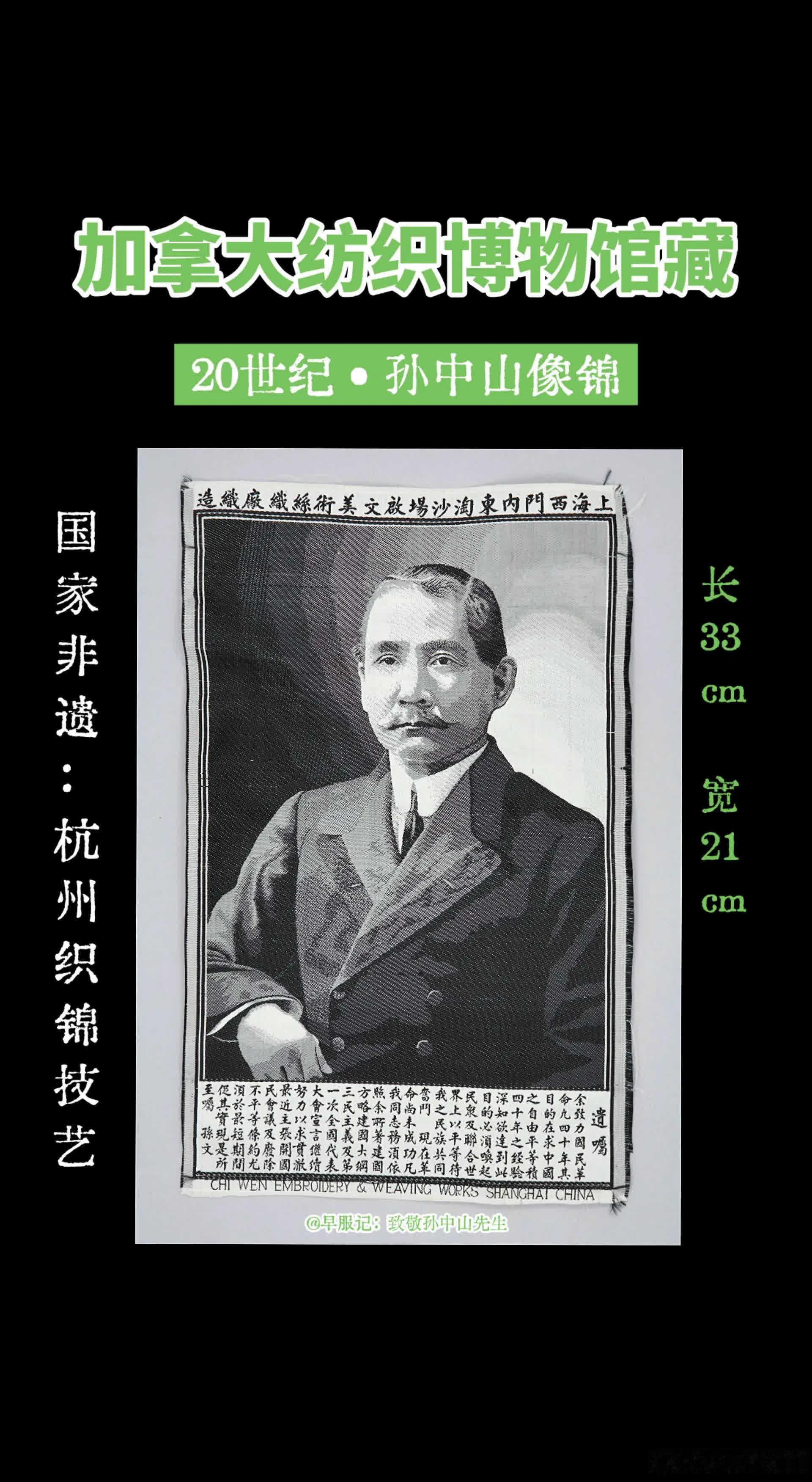加拿大纺织博物馆藏:1926 - 1956 • 中国影像织锦《中山半身遗嘱像》,长 33 厘米 x 宽 21 厘米,上海啟文美术丝织厂织造。2005年,凯尔·乔利夫捐赠入藏。此像锦和美国南加州大学数字图书馆藏的《啟文丝织厂1936年产品目录》中记载的产品图一样。此幅为带完整遗嘱+厂铭+英文落款的全品,无破损污渍折痕,存世量少,是中国早期人像织锦的代表作品,也是海内外纪念孙中山先生的重要实物,兼具工艺与历史价值,收藏价值高。啟文是民国时期杭州著名的丝织企业之一,1926年成立,1956年在公私合营的浪潮中,被并入「都锦生丝织厂」,作为独立厂名消失,其技艺与品牌由都锦生体系传承。 【简介】:颜色:白色;黑色;灰色材料:丝绸技术:提花;机器织造编码:T2005.28.1来源:凯尔·乔利夫的捐赠❶顶部织有厂家名:上海西门内东淘沙场啟文美术丝织厂织造❷底部织有厂家英文名:CHI WEN EMBROIDERY & WEAVING WORKS SHANGHAI CHINA(中国上海啟文刺绣织造厂制)❸底部文字内容为《国事遗嘱》:“余致力国民革命凡四十年,其目的在求中国之自由平等。积四十年之经验深知欲达到此目的,必须唤起民众及联合世界上以平等待我之民族,共同奋斗。革命尚未成功,凡我同志,务须依照余所著《建国方略》《建国大纲》《三民主义》及《第一次全国代表大会宣言》,继续努力,以求贯彻。主张开国民会议及废除不平等条约,尤须于最短期间促其实现。是所至嘱!” 【孙中山影像织锦】孙中山织锦像,由民国著名丝绸专家都锦生在1924年首创,织物通过使用阴影组织来表达层次、远近、阴面和阳面。画面通常以孙中山先生的经典肖像为原型(如身着中山装的半身像),背景有时会辅以“天下为公”等字样或革命相关的标志性图案。孙中山《国事遗嘱》于1925年3月孙中山逝世后公布。带遗嘱的孙中山像锦是民国时期纪念孙中山先生的典型产品,在1925–1930年代大量生产发行。孙中山先生的影像织锦常作为民国时期的国礼或珍贵纪念品,是海内外纪念孙中山先生、联络华侨、表达爱国情怀的重要实物,也是中国早期人像织锦的代表,兼具工艺与历史价值。 【啟文丝织厂】❶简介1926年,马震东在杭州坛仙巷创办了啟文丝织厂,采用桑蚕丝与人造丝交织工艺,产品主要为西湖风景织锦、肖像织锦、书画丝织品等丝绸艺术品。主要活跃于20世纪20年代末至40年代,业务在20世纪30年代达到高峰。引进有电力织机,设立三个分厂,产品远销海内外,是当时杭州丝绸对外贸易的重要力量。三个分厂厂址:上海西门内淘沙场(上海啟文美术丝织厂)、杭州庆春门内坛仙巷、杭州武林门内天水桥。此外,还有至少9家发行所,已知上海2家、杭州、汉口、广州、香港、汕头、厦门、青岛各1家。❸重要事件时间线1927年前后筹备的“赴南美华产展览会”,与都锦生等一同被选为丝织品参展代表,旨在推动国货出口。1929年西湖博览会丝绸馆有其陈列。美国南加州大学数字图书馆藏有1936年《啟文丝织厂目录样本》。抗战时期杭州丝织业受冲击严重,但启文坚持在杭州本土惨淡经营,保留核心技术与织工,战后逐步恢复生产。1954年4月,都锦生丝织厂成为杭州市第一批公私合营单位。1956年,在公私合营中,啟文丝织厂被并入都锦生,结束独立经营,作为独立厂名消失。其技艺与品牌由都锦生体系传承。 【杭州像锦荣誉】2011年,经国务院批准,由都锦生申报的《杭州织锦技艺》列入了第三批国家级非物质文化遗产名录。1915年,元震和的黑白像锦《平湖秋月》代表中国参加巴拿马太平洋博览会,一举获得了金奖。1926年,都锦生的五彩像锦《宫妃夜游图》,荣获美国费城世界博览会金奖,杭州像锦被誉为“东方艺术之花”,誉满全球。从民国今,都是馈赠好友的最佳礼品之一,开业大吉、新婚大喜、奖励先进工作者等等,还常被用作国礼,受到各界人士的喜爱。 【像锦】像锦,即「影像织锦」,也称:织锦画、丝织照片、像景织物、都锦生织锦等。是以真丝和人造丝为主要原料、采用色织提花织造工艺将人像、风景以及名人书画等图像进行艺术再创造的丝绸艺术品。该项工艺在20世纪20年代由民国著名丝绸家都锦生创制。按其结构、色彩运用可分为三大类:黑白像锦、填彩像锦和多彩色织像锦三大类。❶第一种是黑白像锦,只用黑线和白线。以白色真丝为经线,黑、白两色人造丝作纬线,通过变化织物纹样组织的方法,获得多层次的黑白、明暗效果,擅长于表现水光山色、雾雨阴晴以及传统的中国水墨画的效果。被誉为“天上云霞,地下鲜花”。❷第二种是填彩像锦,在黑白织锦上涂染颜色,是织与彩绘结合。❸第三种是多彩色织像锦,或称:彩色像锦、彩色像景、五彩锦绣:全部都用染好颜色的丝线织图案。彩色像景以双股熟丝为经线,彩色人造丝为纬线而织成。历史