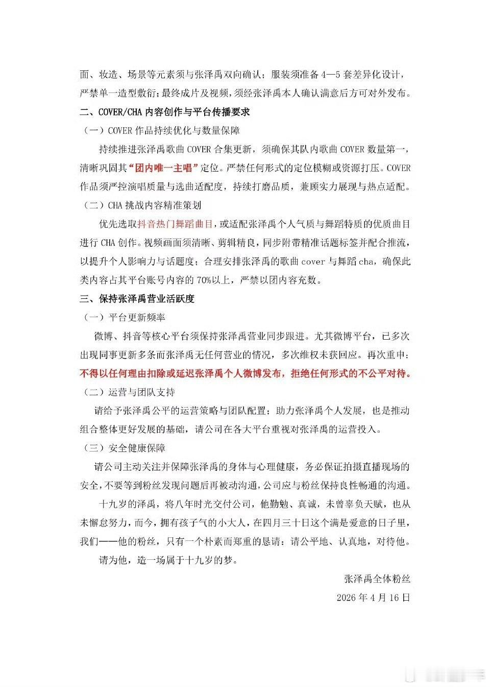 粉丝要求公司筹备张泽禹19岁生日张泽禹19岁生日专属营业筹备要求张泽禹凭实力与人气一路走到现在,不是被区别对待的理由,19岁生日请正常筹备,别再敷衍了事!