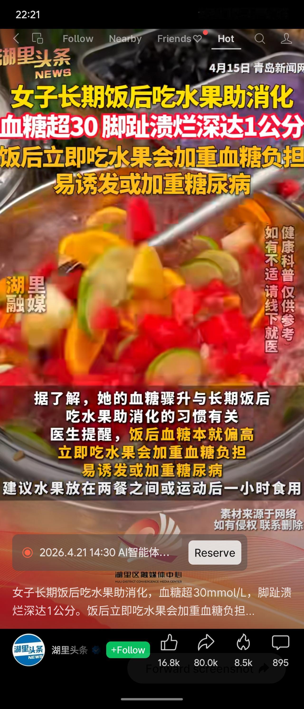 宁波40岁华女士长期饭后立即吃水果助消化,导致血糖骤升超30mmol/L,引发糖尿病化脓性甲周炎,脚趾溃烂深达1公分,血管、神经、肌腱坏死,经手术才免于截肢。医生提醒:饭后血糖本就偏高,立即吃水果会加重负担,易诱发或加重糖尿病,建议两餐之间或运动后一小时食用。