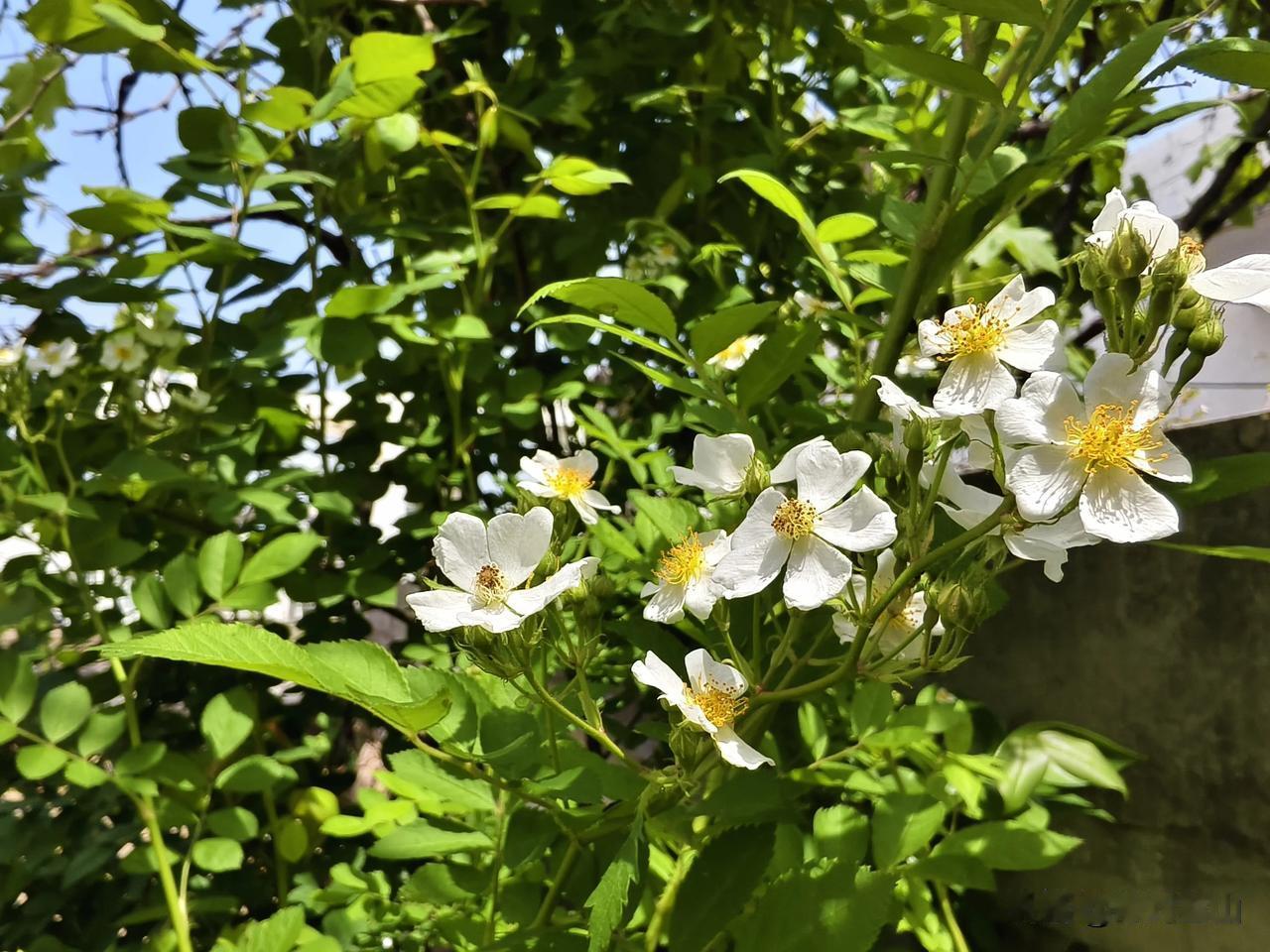 第二年就有开的,后来每年都有盛开的,并且花朵越来越多,今年的竟然长提前开出来好几串白色的小花,我用手机拍照查了一下,竟然是野蔷薇。