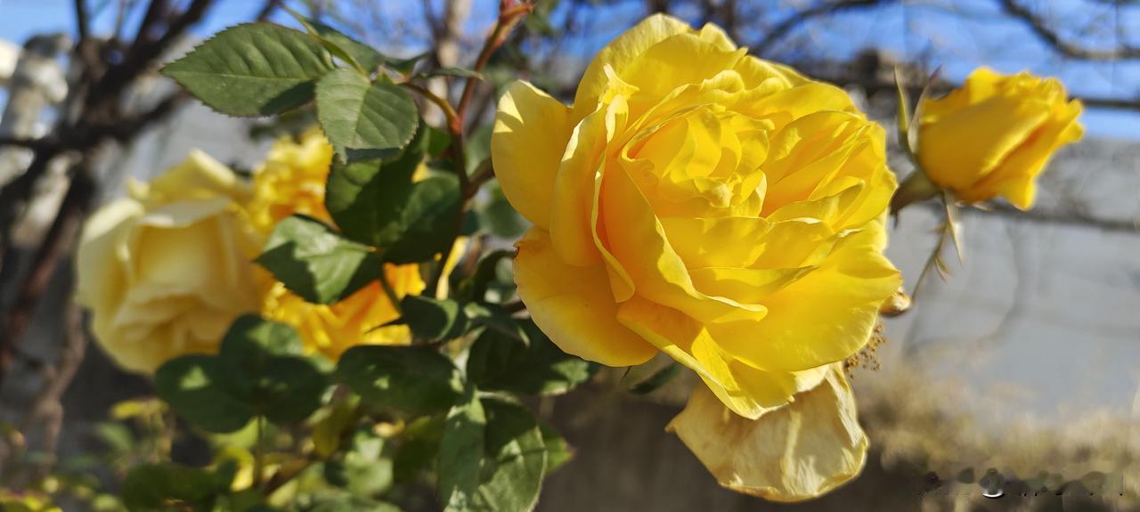 图一是新开的野蔷薇,图二是黄色月季花苞,图三是去年开的黄色的月季花,都是同一棵上开的,不同枝。