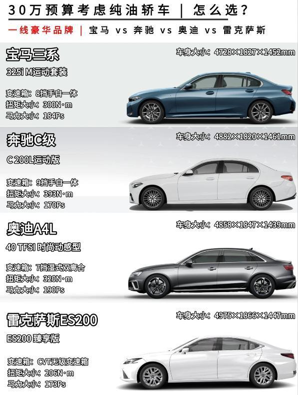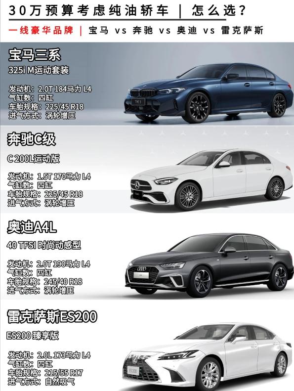 预算30万想买豪华品牌纯油轿车,纠结症又犯了?宝马、奔驰、奥迪、雷克萨斯四大热门选手同台PK,每款各有亮点、各有短板,今天一次性梳理清楚,从优势到短板、从适配人群到选购优先级,全方位解析,帮你快速锁定适配自己的那一款!