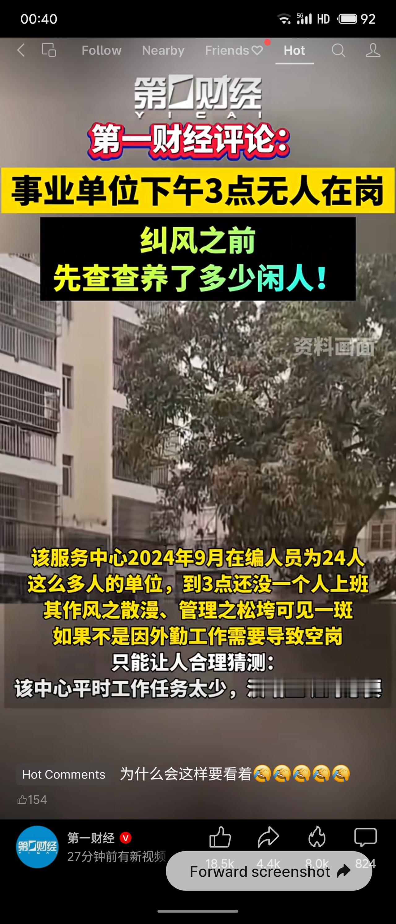 近日有网民反映,广西钦州市钦北区小董镇农业服务中心在工作日下午3点仍无工作人员在岗。镇政府通报确认属实,已对相关人员批评教育并责令书面检讨。据悉,该中心2024年9月在编人员达24人。第一财经评论指出,此事暴露出作风散漫与管理松垮,更应追问:是否因事设岗?是否存在人浮于事?与其只纠风,不如先查清养了多少闲人。优化公职岗位设置,才能提升治理效能,把财政资金用在刀刃上。