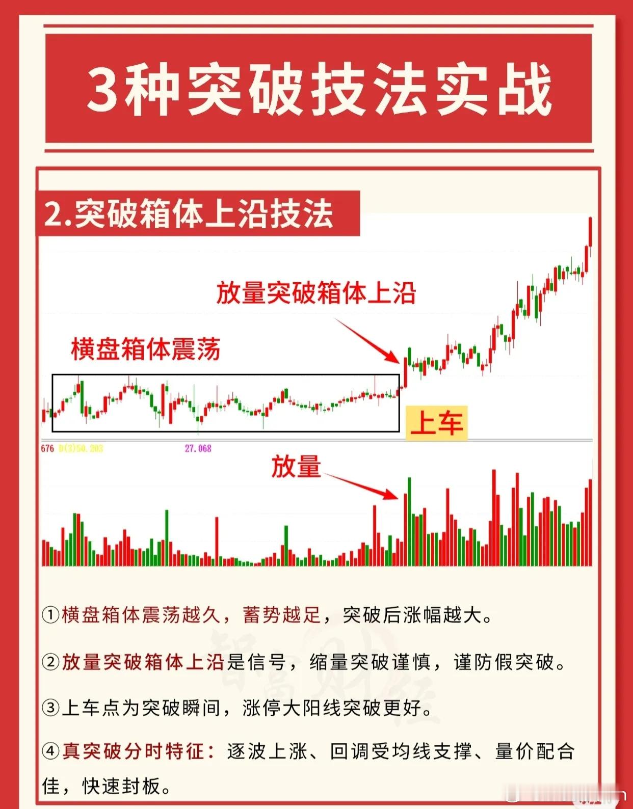 - 突破信号的关键:放量突破箱体上沿是有效信号;若缩量突破,需谨慎对待(易成假突破,股价可能回落至箱体内)。- 上车时机选择:突破瞬间即为最佳“上车点”,若以涨停大阳线形态突破,可靠性更强。- 真突破的分时特征:分时图中股价逐波上涨、回调时能受均线支撑、量价配合良好(量增价涨),且能快速封板,这类突破的持续性更有保障。