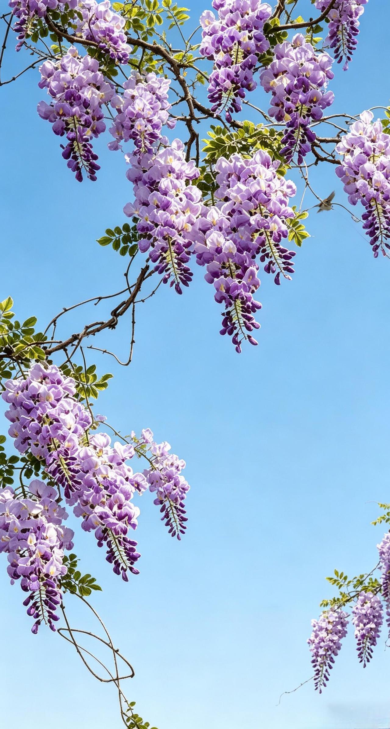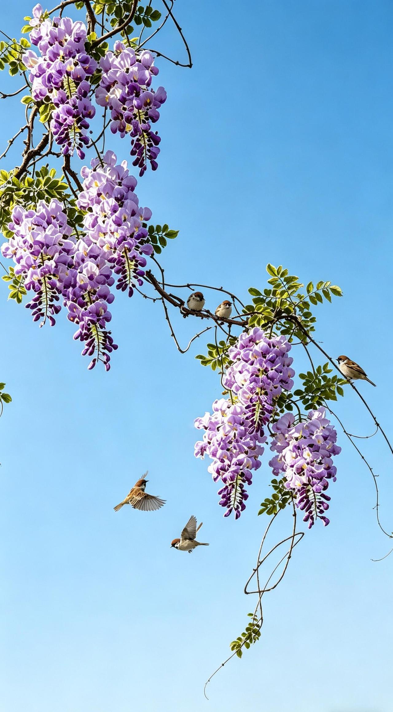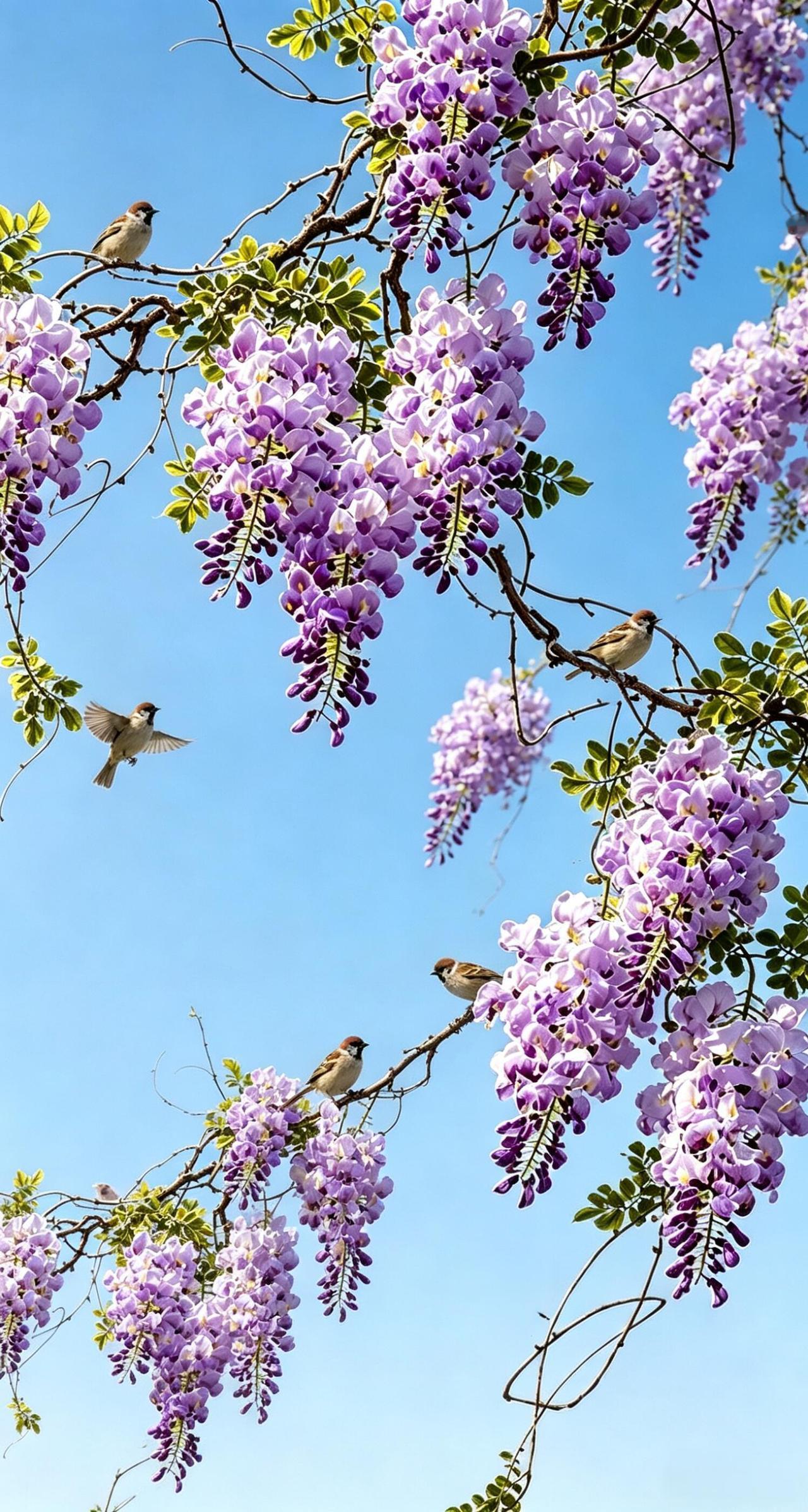 这些鸟并不急着赶路。它们在花藤间跳跃、啁啾,偶尔振翅,在紫藤编织的穹顶下盘旋半圈,又落回原处。花影在鸟羽上流动,鸟鸣在花穗间穿梭——分不清是花成了鸟的背景,还是鸟成了花的韵脚。