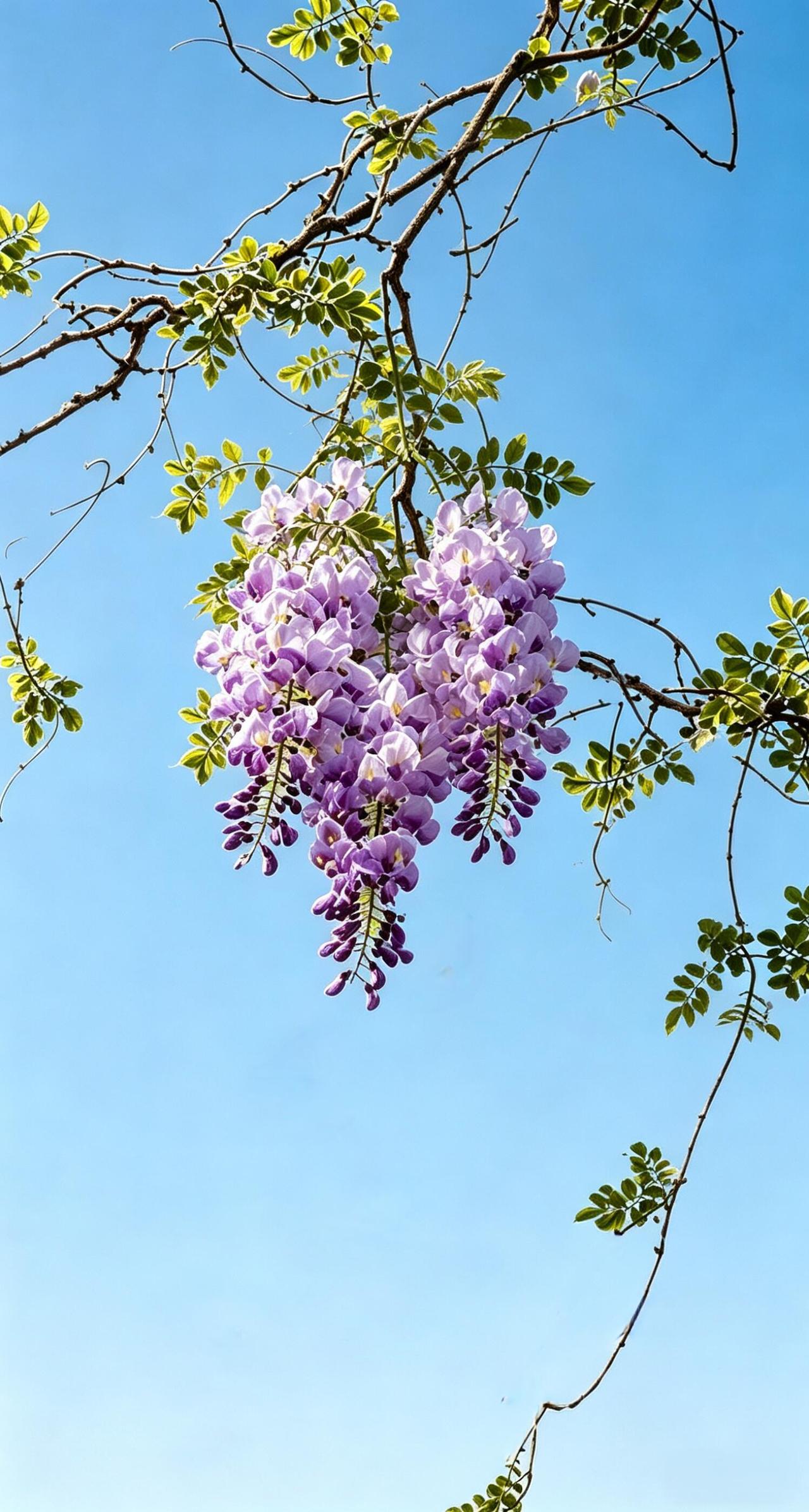 暮春的风还带着凉意,紫藤已开成了瀑布。深深浅浅的紫从檐角垂落,像谁打翻了胭脂盒。藤蔓虬曲盘绕,老干如蛟龙,嫩梢似游蛇,在花穗间编织出疏密有致的网。