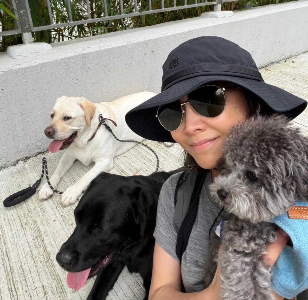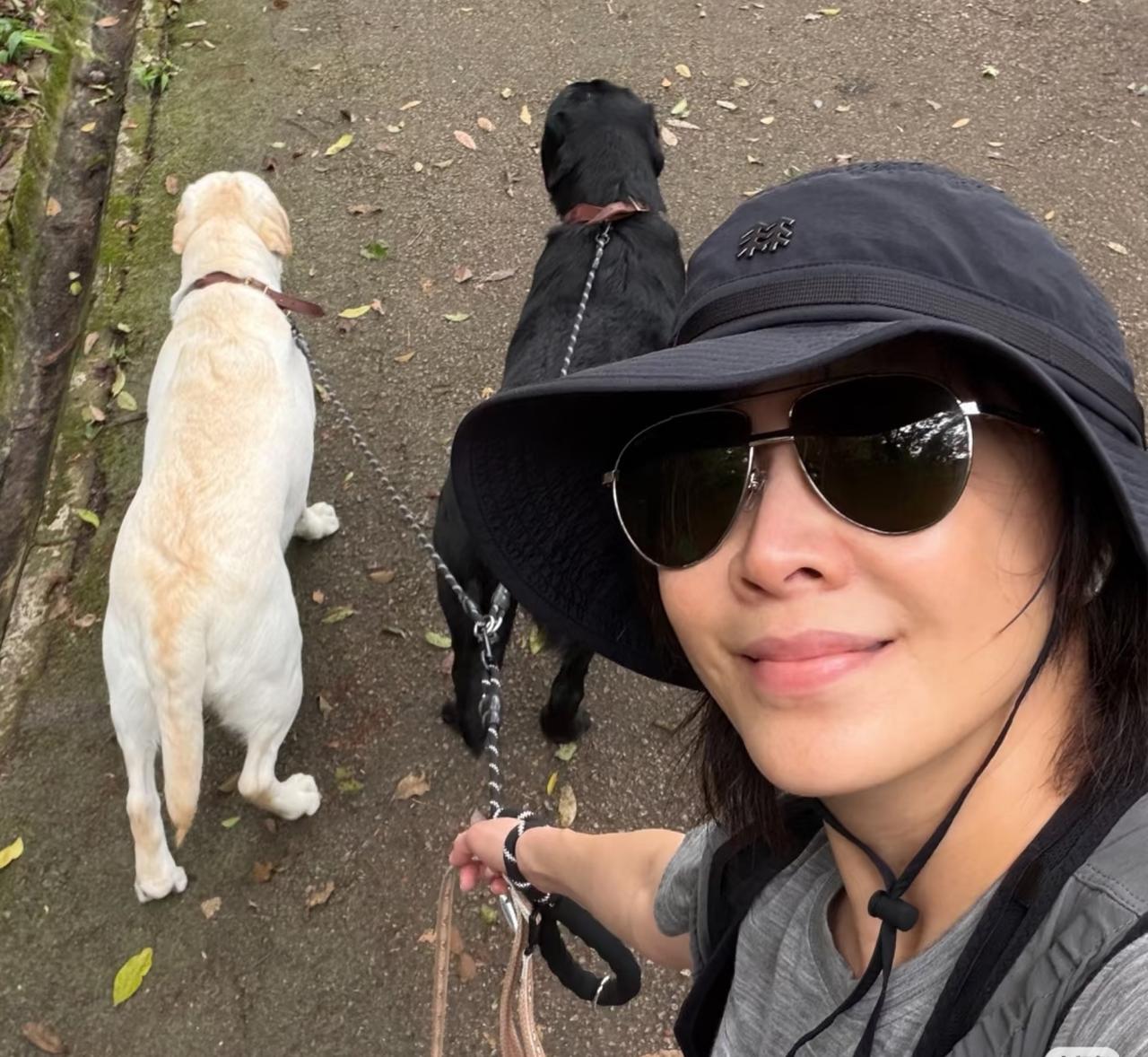 刘嘉玲平素喜欢晨运,怀抱呆萌的泰迪,与三只狗和谐相处,活出普通人羡慕的松弛感。