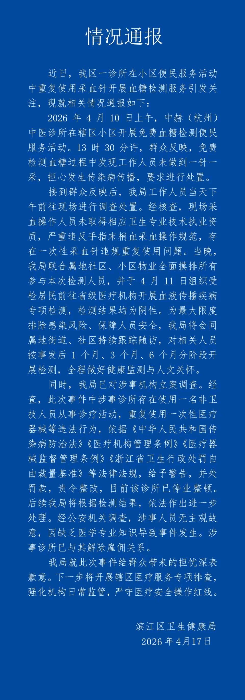 诊所义诊用同一针头给15人采血,这种行为难以容忍、无法理解。