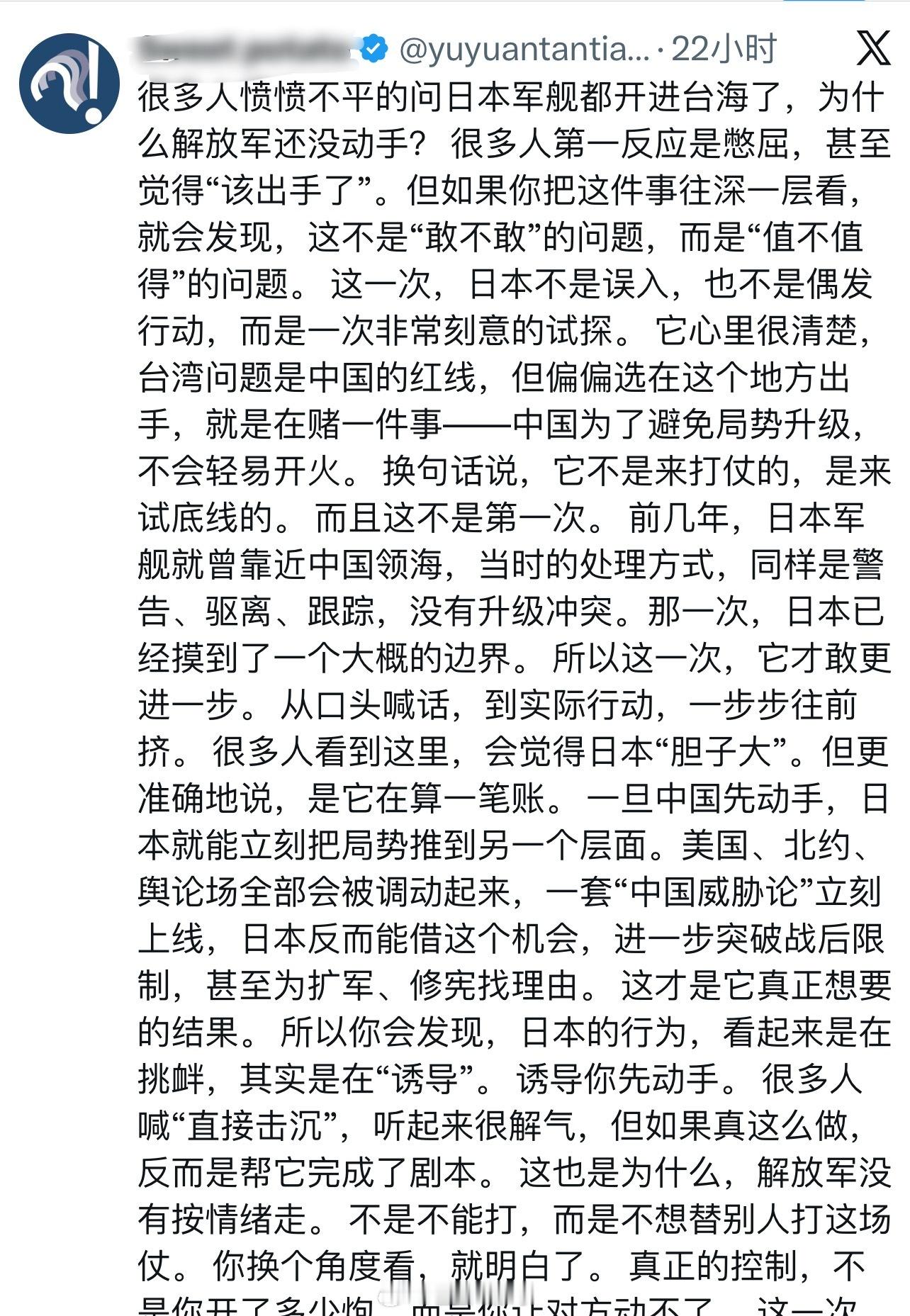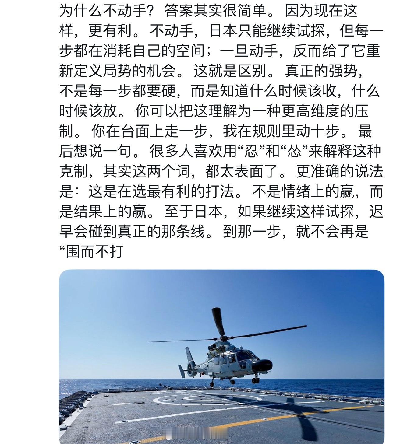 为什么不动手? 答案其实很简单。 因为现在这样,更有利。 不动手,日本只能继续试探,但每一步都在消耗自己的空间;一旦动手,反而给了它重新定义局势的机会。 这就是区别。 真正的强势,不是每一步都要硬,而是知道什么时候该收,什么时候该放。热点解读