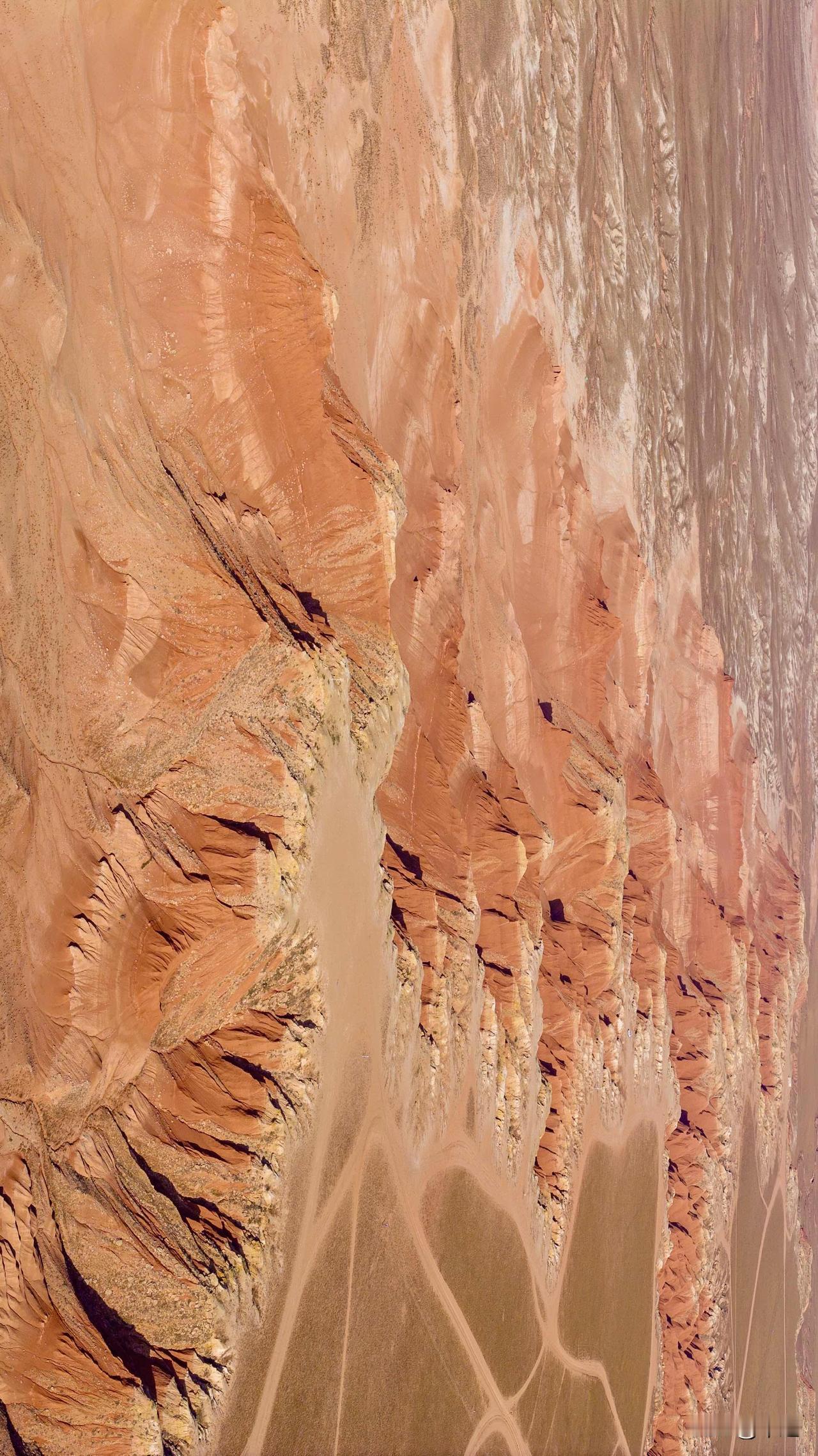 山体南北绵延约8公里,东西横亘约5公里,属于戈壁草原台地断崖,亦是第三系标准地层剖面。历经亿万年的风化与剥蚀,造就了层叠的沟壑。山峦的赤红色彩浓郁,从砖红过渡到赭石红,还有局部呈现青灰色,恰似大自然精心勾勒的画卷。