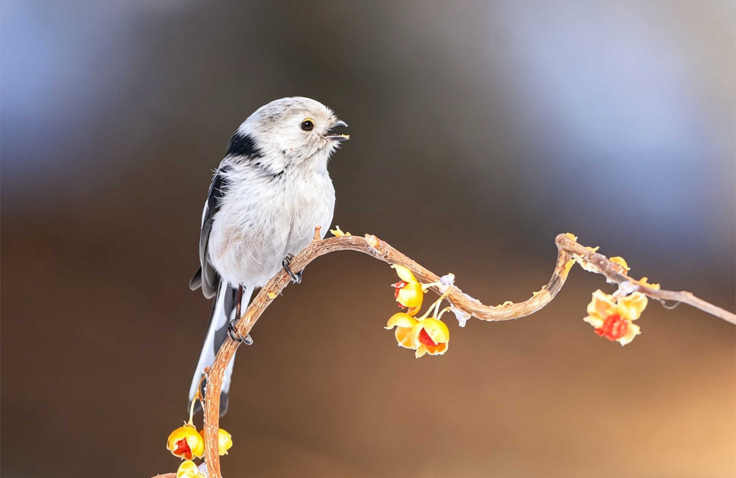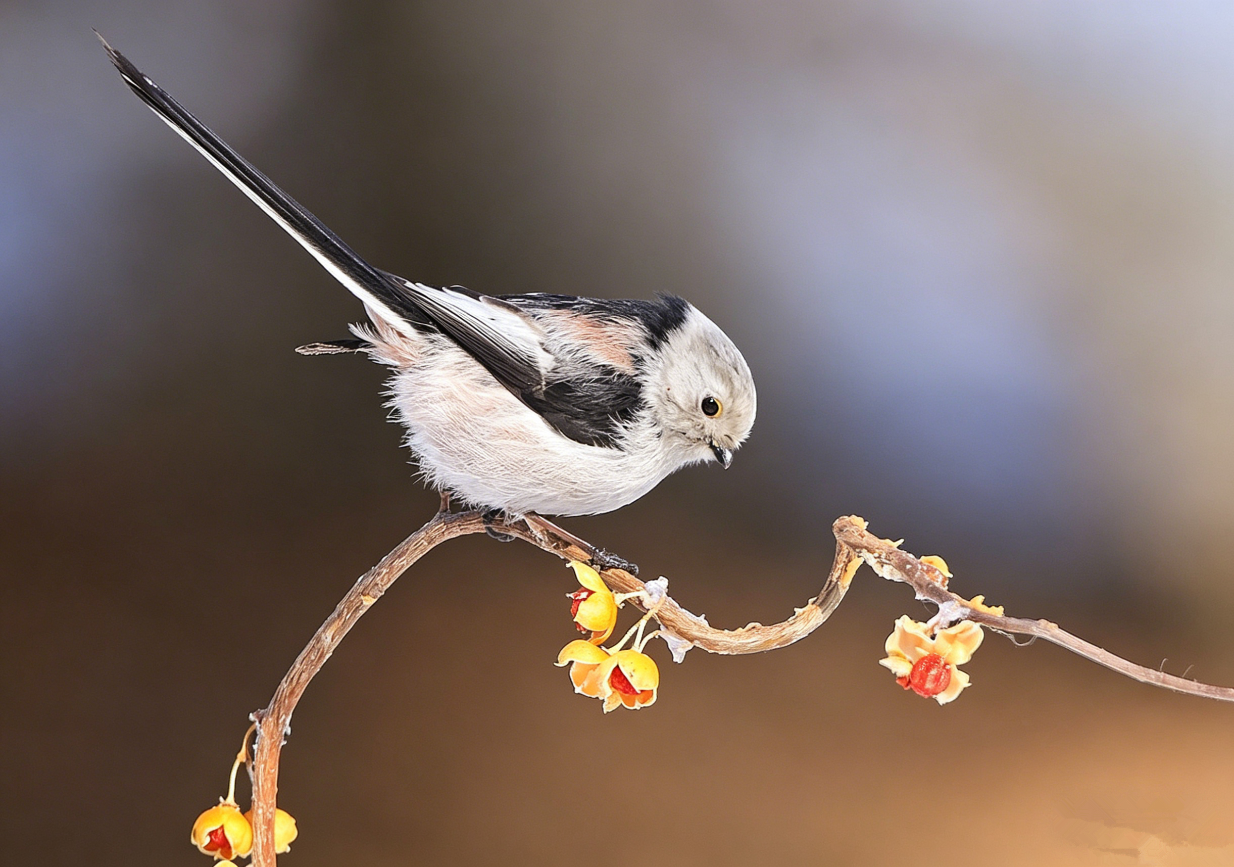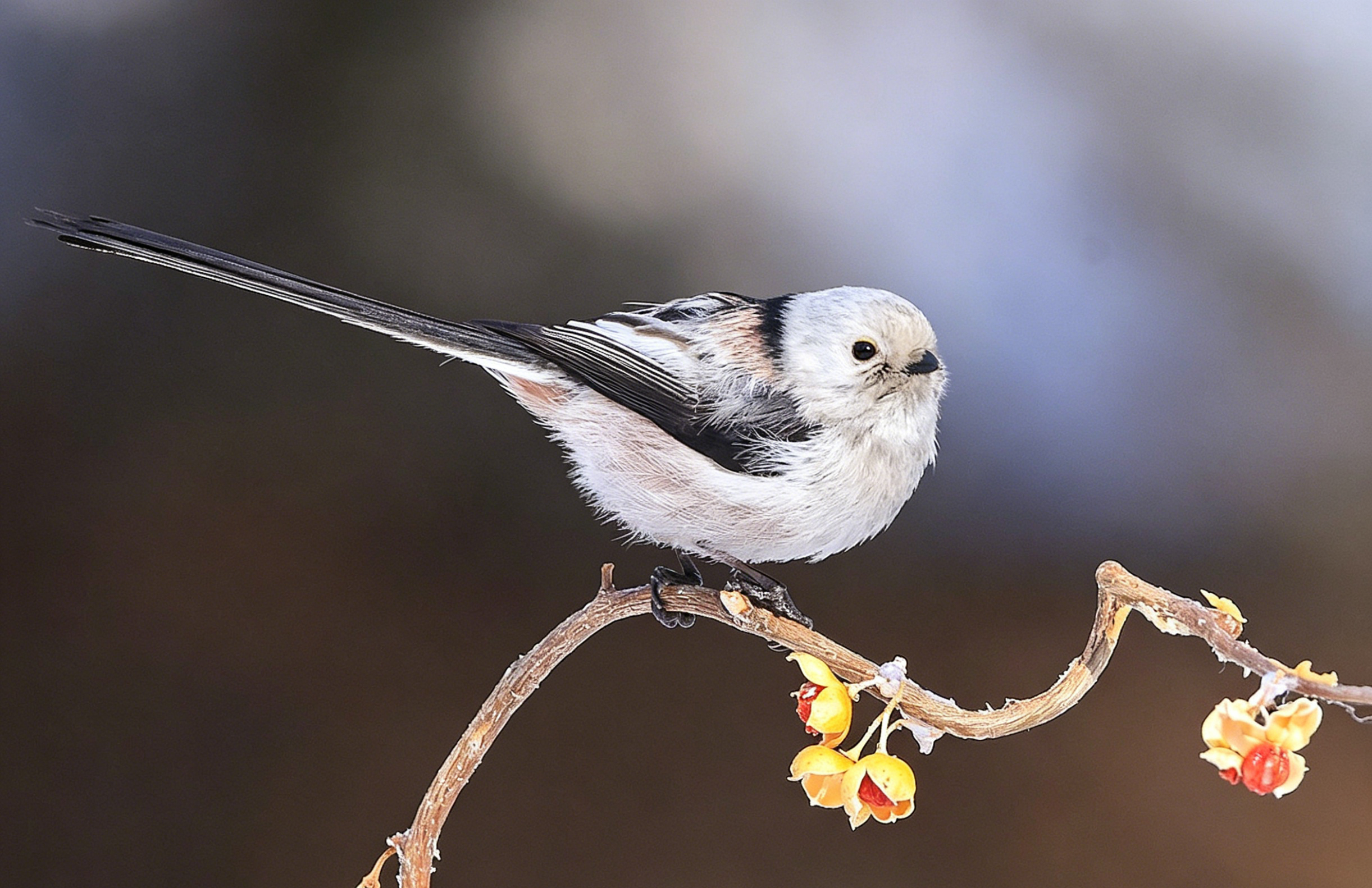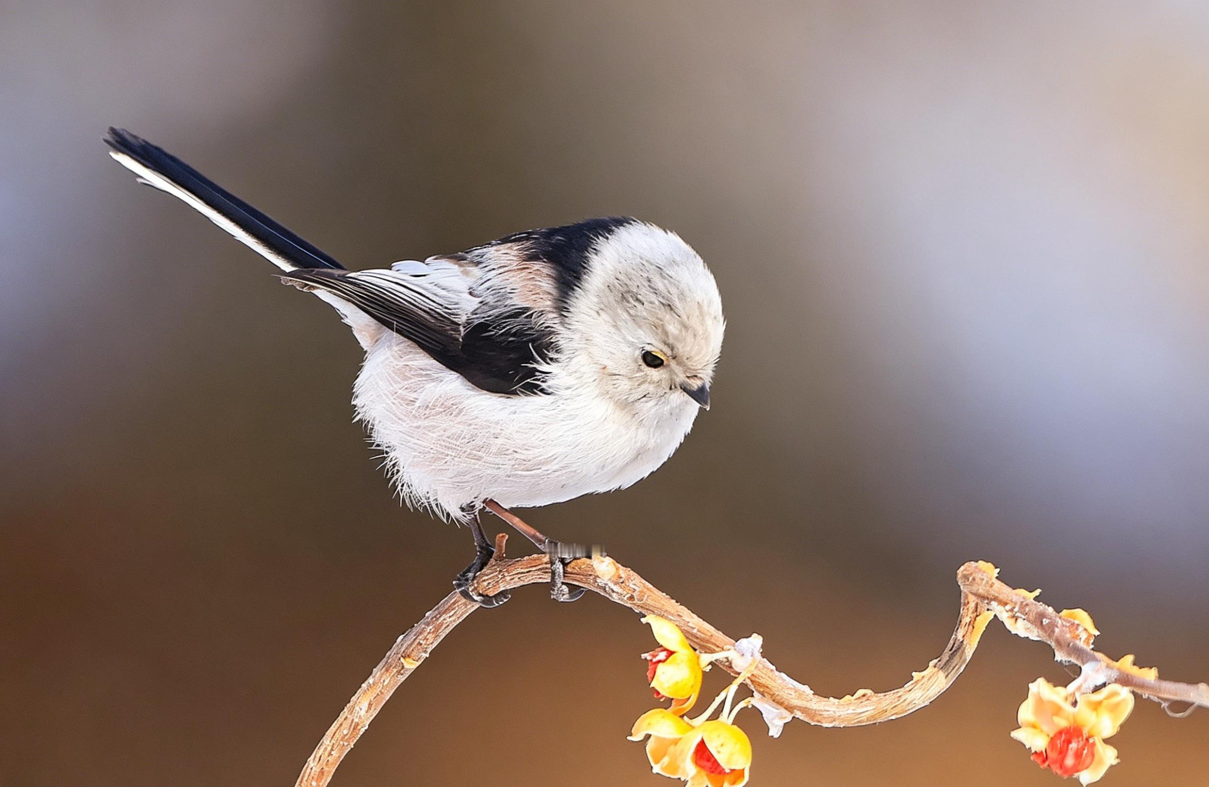 翻到以前拍的北长尾山雀(就是超萌的“肥啾”)!它圆滚滚的像个小毛球,稳稳站在挂满黄果的枝头上,小眼睛滴溜溜转,一会抬头瞅瞅,一会低头啄啄。当时蹲在寒风里守株待兔,冻得手脚冰凉,但看到它那副呆萌样,心瞬间被治愈了,只想悄悄按下快门,把这软乎乎的可爱永远留住~