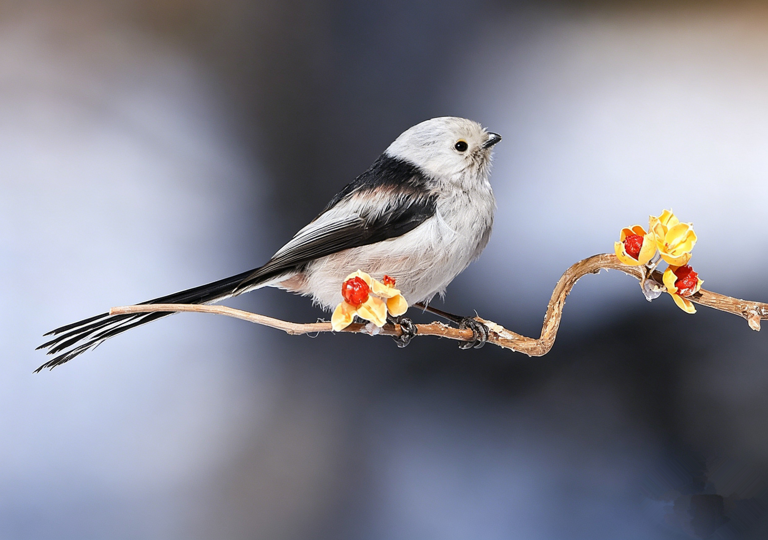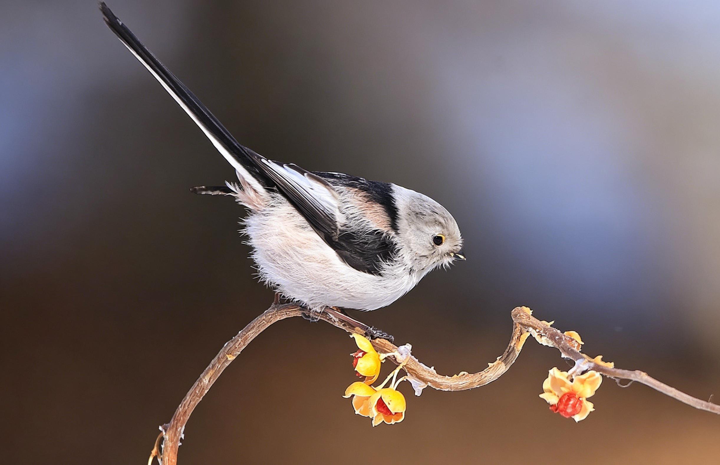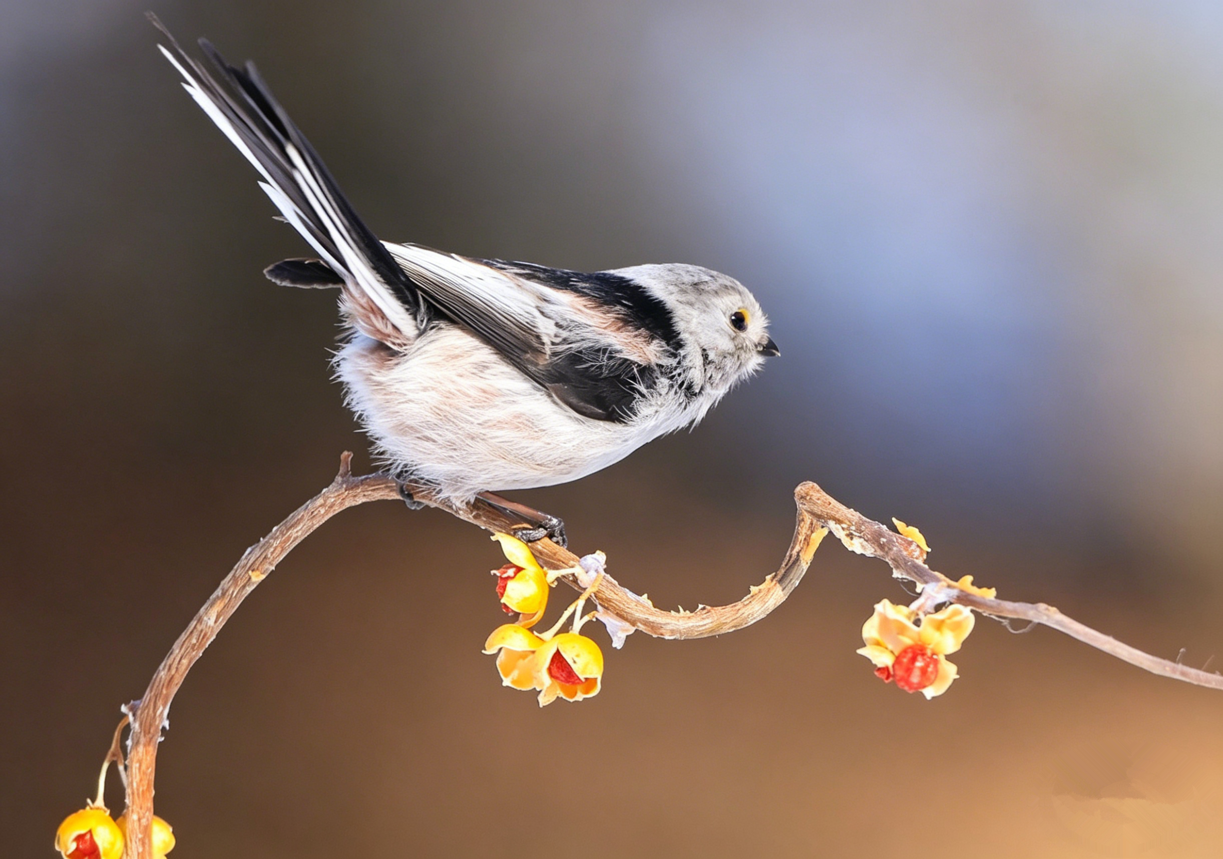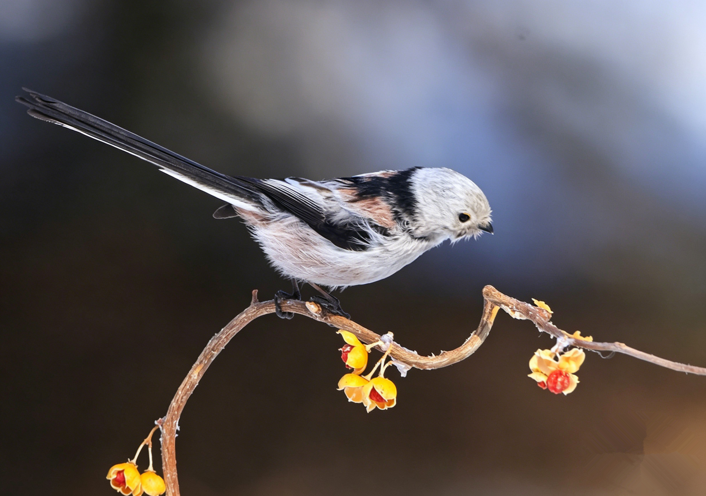 翻到以前拍的北长尾山雀(就是超萌的“肥啾”)!它圆滚滚的像个小毛球,稳稳站在挂满黄果的枝头上,小眼睛滴溜溜转,一会抬头瞅瞅,一会低头啄啄。当时蹲在寒风里守株待兔,冻得手脚冰凉,但看到它那副呆萌样,心瞬间被治愈了,只想悄悄按下快门,把这软乎乎的可爱永远留住~