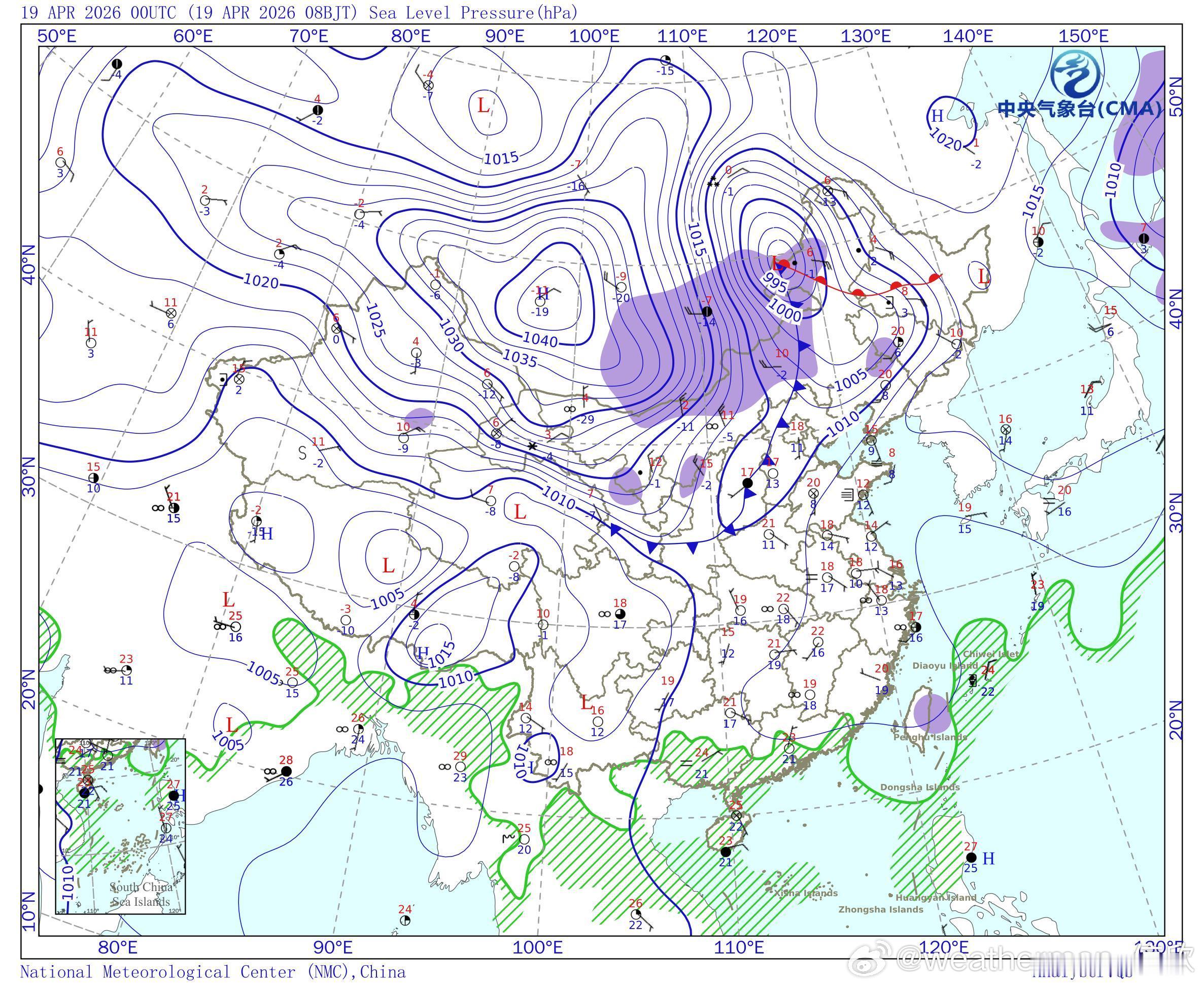 【速冻】今天实况天气图上,可见蒙古一带冷高压达到了1040百帕。这个强度在4月算是很强的冷空气。今天内蒙古中部处于冷锋后部,气压梯度最大,冷平流最强区域。今天下午对比昨天下午,部分站点降温会超20℃,比如:二连浩特、满都拉、苏尼特左旗、阿巴嘎旗、那仁宝力格,应该都能登上下午的降温榜。