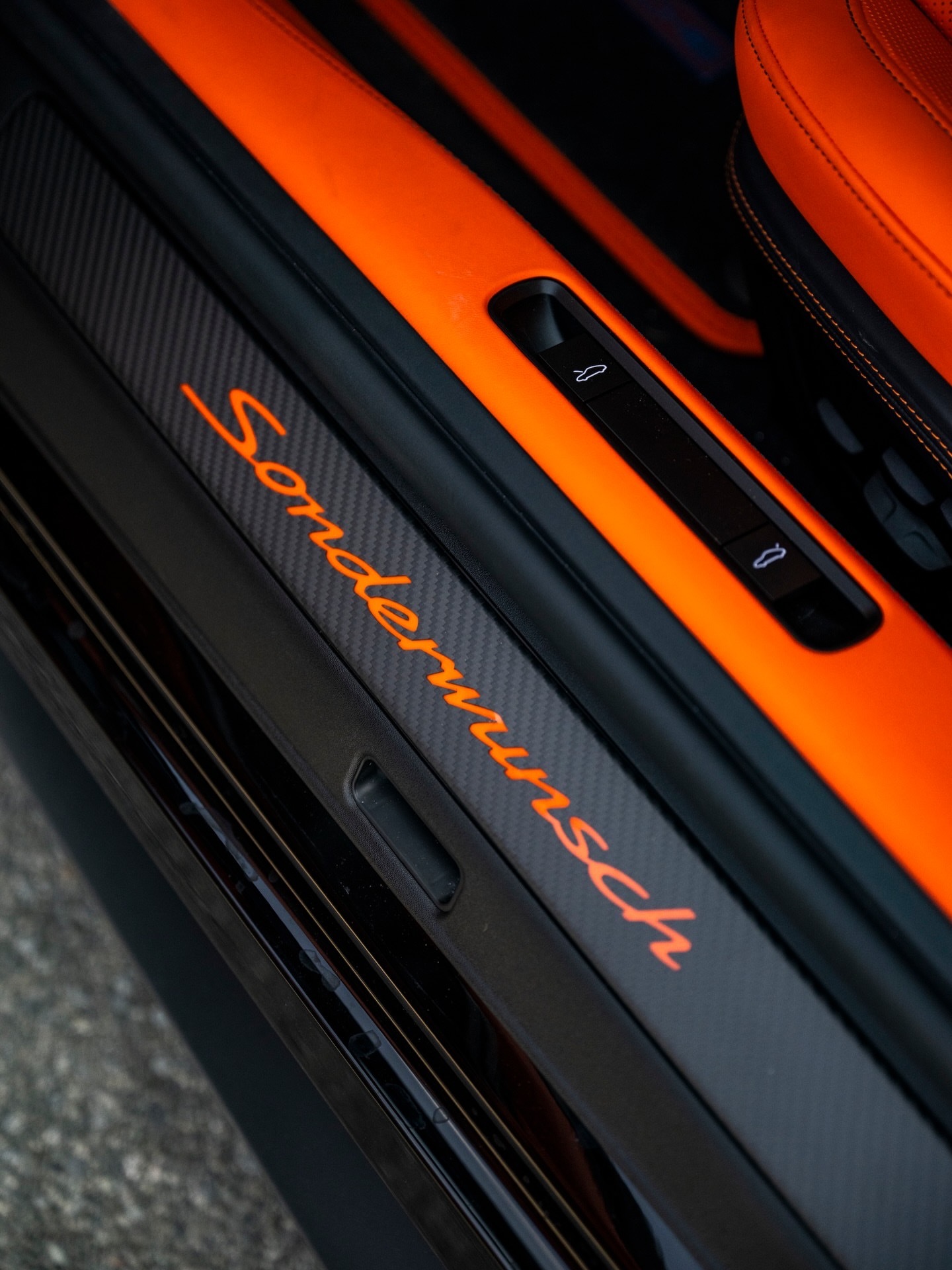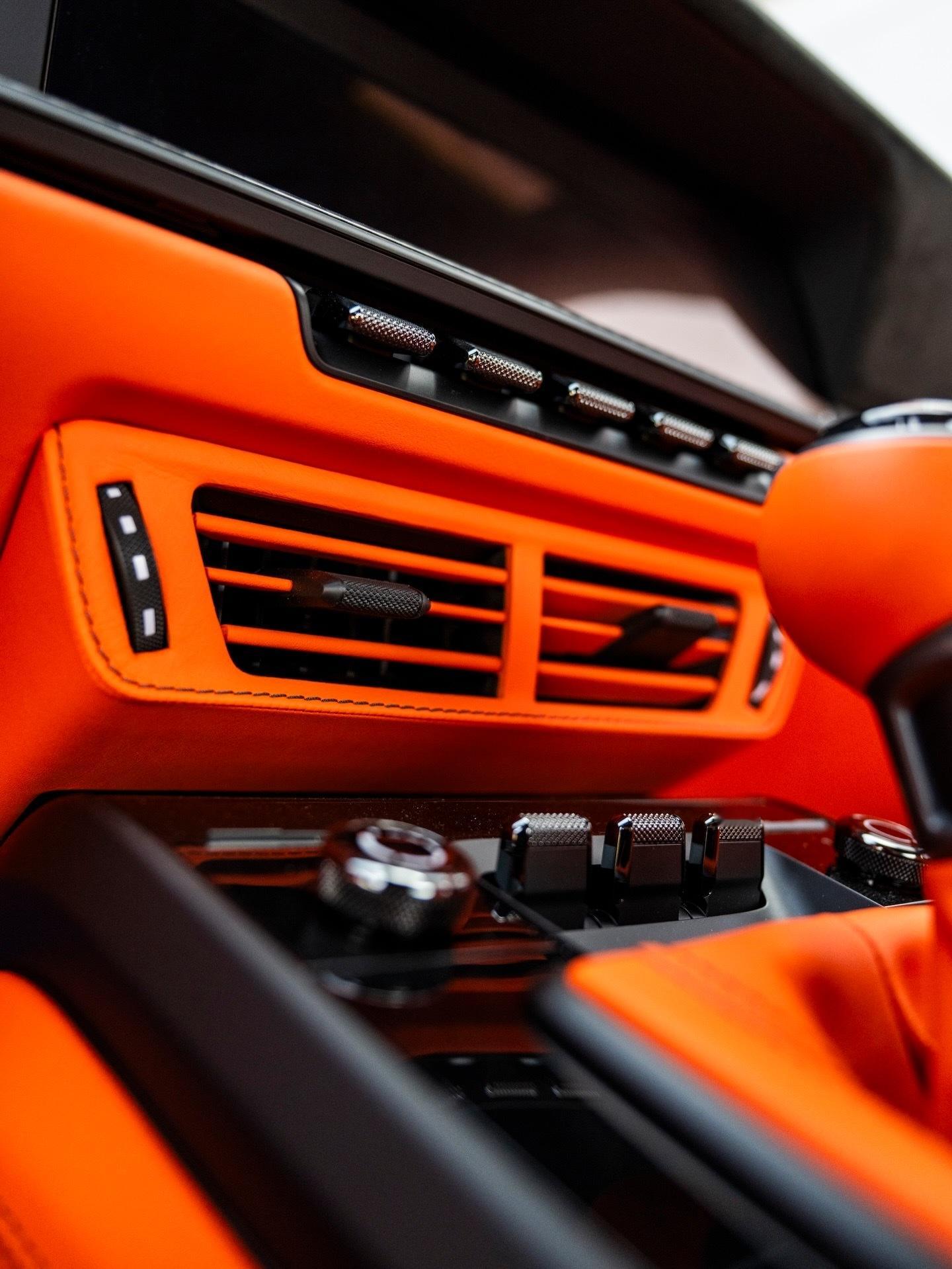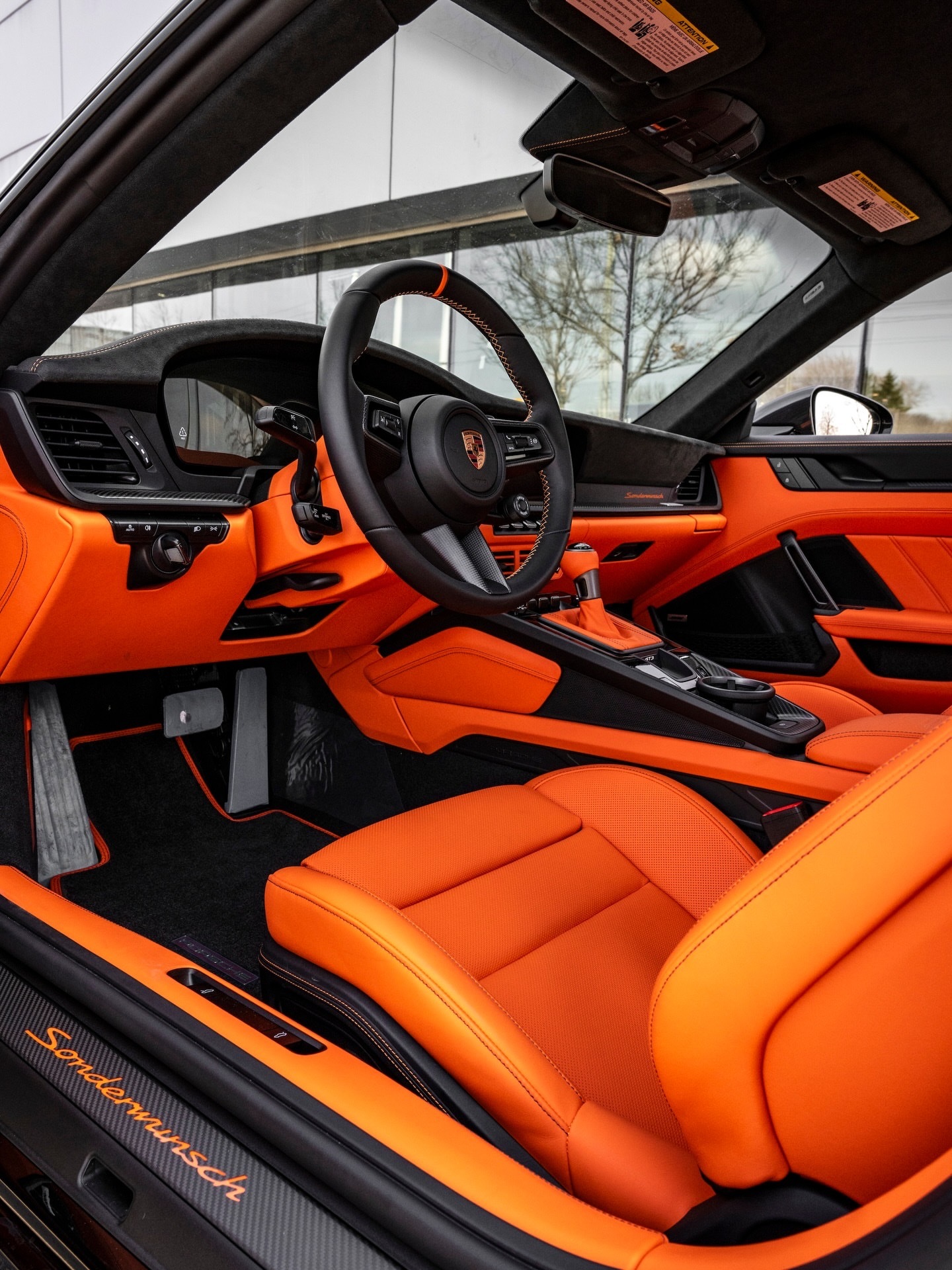 PDLS装饰环、轮毂中心盖、轮辐和徽标均以海湾橙涂装。步入车内,更令人惊叹。完整的Sonderwunsch内饰采用Arancia Mira皮革,搭配对比鲜明的黑色缝线、滚边和Race-Tex材质。座椅、换挡杆、膝垫、门板、出风口、方向盘标记、转向柱等均饰以同样美妙的橙色。