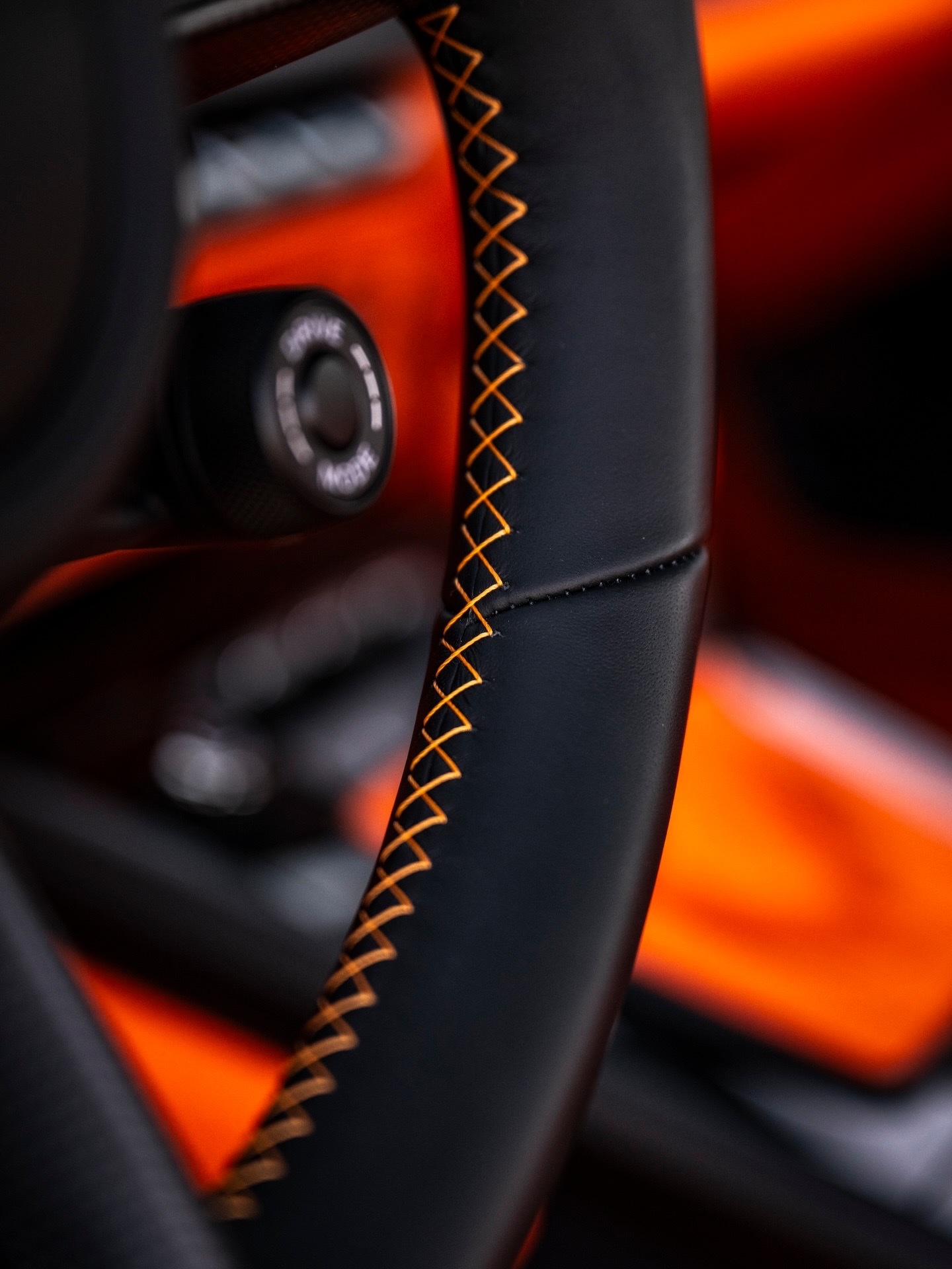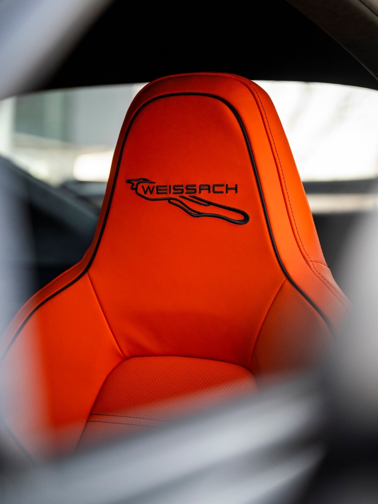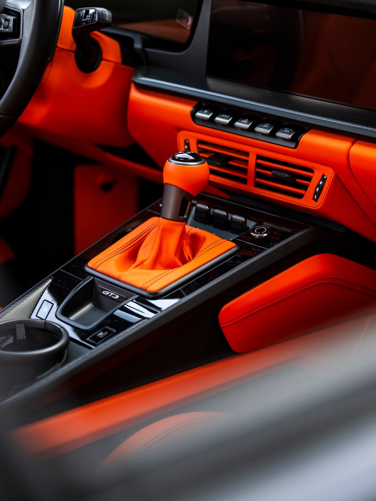 PDLS装饰环、轮毂中心盖、轮辐和徽标均以海湾橙涂装。步入车内,更令人惊叹。完整的Sonderwunsch内饰采用Arancia Mira皮革,搭配对比鲜明的黑色缝线、滚边和Race-Tex材质。座椅、换挡杆、膝垫、门板、出风口、方向盘标记、转向柱等均饰以同样美妙的橙色。