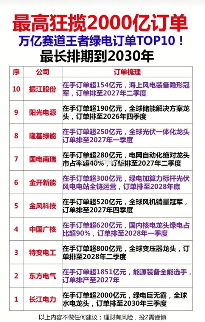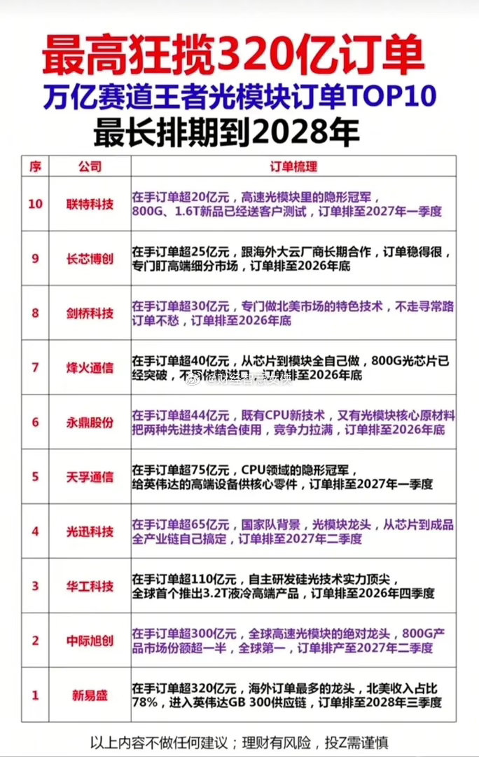 订单排期拉满,业绩爆发在即!从国产存储、绿电、创新药,到光模块、锂电池,再到光通信全产业链,多大赛道龙头订单狂揽百亿甚至千亿,排期最长已至2030年,叠加部分公司业绩同比暴增超30倍。✅存储芯片:最高狂揽380亿订单,排期至2028年✅绿电赛道:手握2000亿订单,排产延伸至2030年✅创新药:年报业绩最高暴增3007.39%✅光模块/光通信:320亿订单在手,产业链景气度持续上行✅锂电池:千亿级订单锁定,产能排期直逼2030年。⚠️以上内容仅为公开信息整理,不构成任何投资建议,理财有风险入市需谨慎。