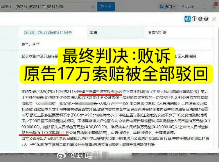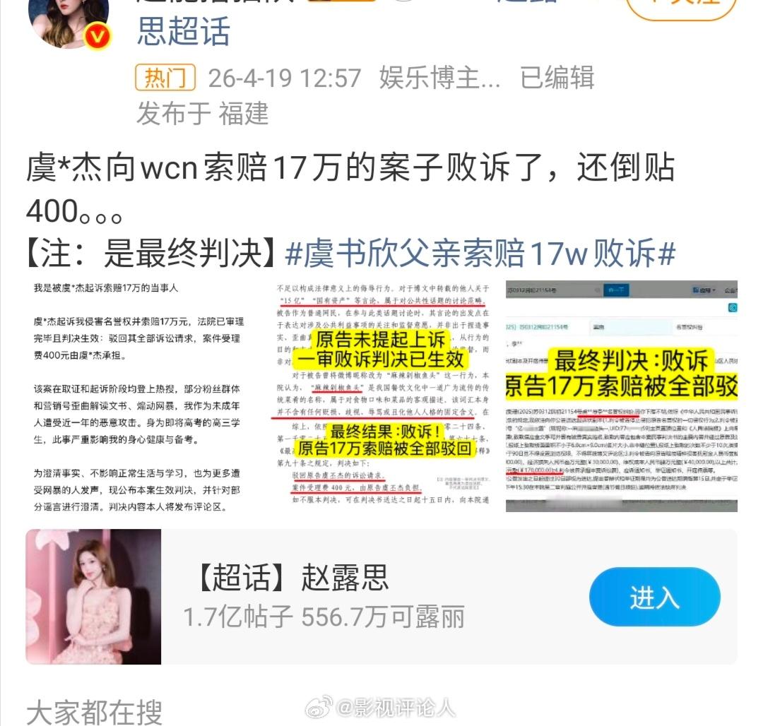 虞书欣父亲索赔17w败诉一边虞书欣好辣,一边虞书欣父亲败诉了,这场可判赵露思赢虞