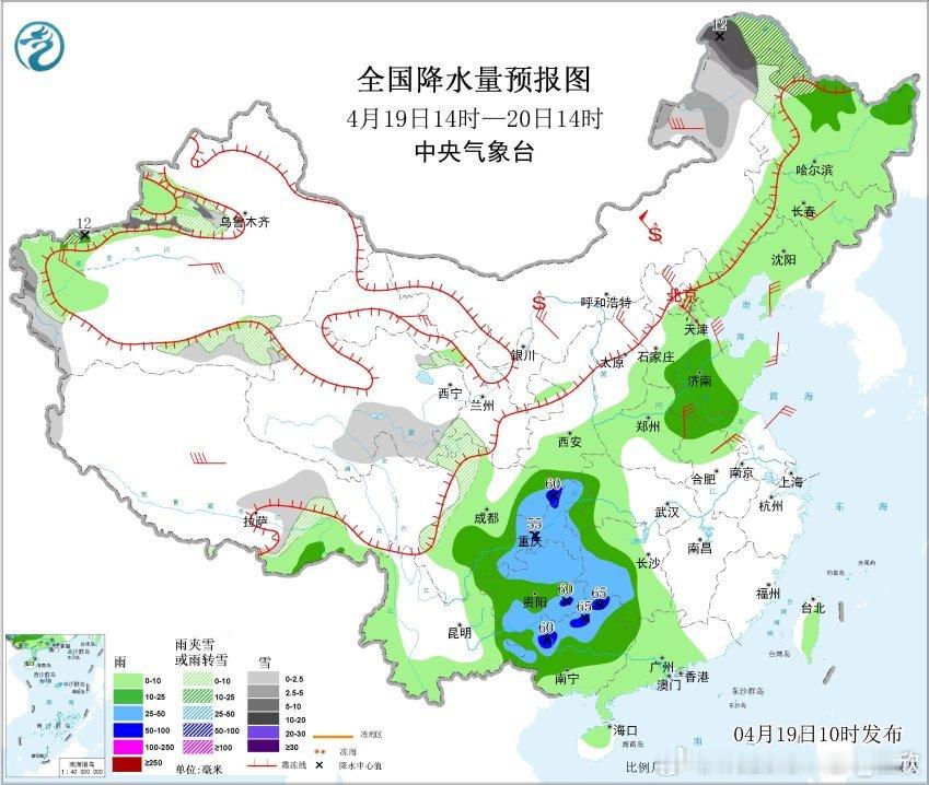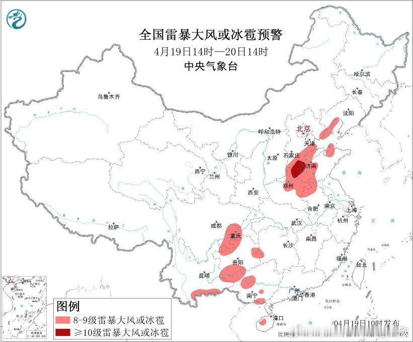 预计4月19日14时至20日14时,华北东南部、黄淮中北部、西南地区东部和南部、华南西部等地的部分地区将有8级以上雷暴大风或冰雹天气,其中,河北东南部、山东西北部、河南东北部等地的部分地区将有10级以上雷暴大风,最大风力可达11级以上;