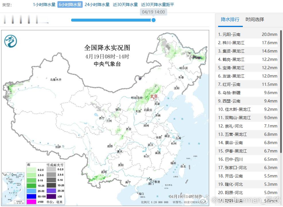【强降水和强对流】从今天白天的卫星云图看,北方地区有一个如同逗号的锋面气旋云系,导致东北华北部分地区出现降水,内蒙古和黑龙江部分站点出现降雪或雨转雪。同时南方的偏南暖湿气流也加强,云南广西贵州四川等地降雨在发展。通常此时经常登顶高温榜的云南元阳,出现20毫米降雨,排名08-14时,6小时降水榜第一。