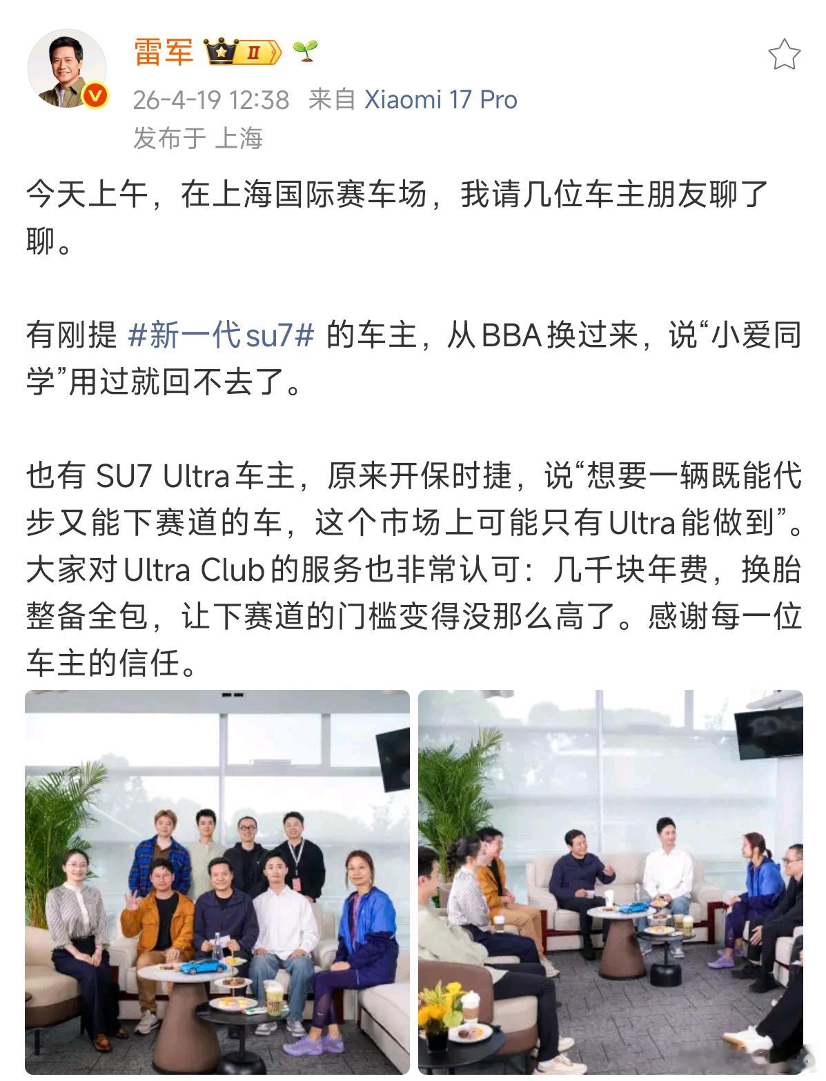 雷总嘴上说着我也不想这么拼,我也想休息,但脚步却一点也没停。刚完成北京到上海1313公里超高强度直播,周末也一点没有要休息的意思,继续参与CHINA·GT的相关活动,看比赛,和小米汽车用户交流。从放出的照片就可以看出来,与用户的交流很放松,雷总依旧是那个愿意倾听用户声音的千亿总裁。1313公里的直播,雷总把销售的工作做了;和用户的交流,雷总又把市场调研的工作给做了。难怪好多其他企业的员工都说,能不能让我们的老板也和雷军一样拼。就我目前从线下了解的信息,雷总周五的直播破圈效果非常好,线下进店人数增长不少;从各大平台的相关评论区来看,对这次直播,特别是对雷总本人的看法,也多以正面为主。有不少人表示路转粉,因为对雷军本人的钦佩,产生了要试驾小米汽车的念头。用拆车直播证实车子用料扎实,车辆性能够稳定,还是老总亲自上阵,这种车企造的车,卖得好才是必然的。