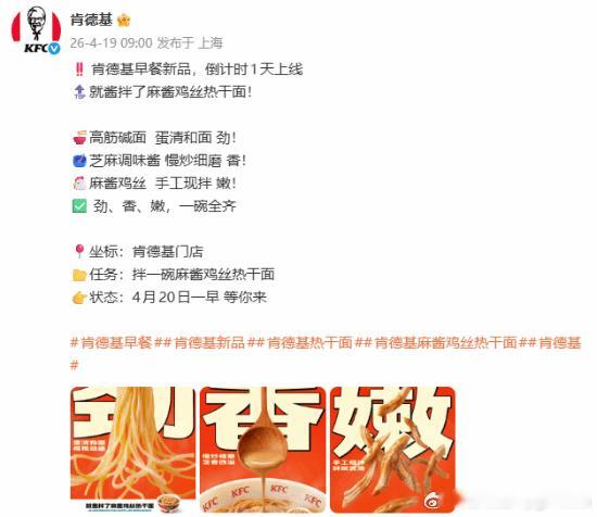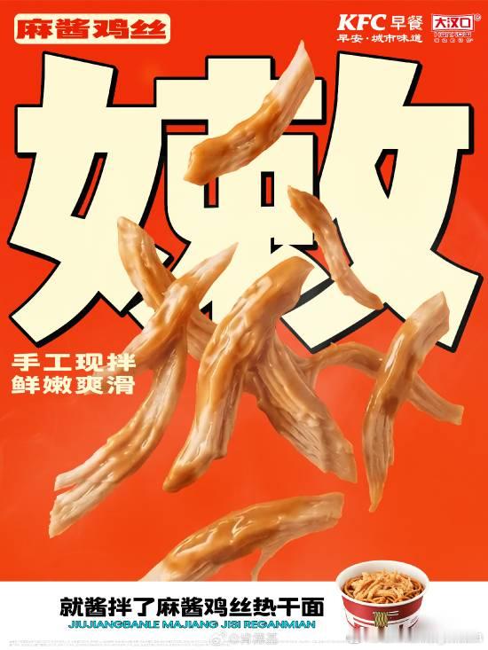 肯德基官宣颠覆认知的新品——麻酱鸡丝热干面近日,肯德基官方公布早餐新品——麻酱鸡丝热干面倒计时1天上线“高筋碱面 蛋清和面 劲!芝麻调味酱 慢炒细磨 香!麻酱鸡丝 手工现拌 嫩!劲、香、嫩,一碗全齐”不得不说肯德基新品本土化这一块还是挺有研究的。