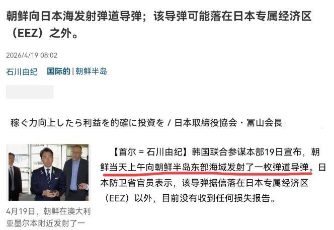 4月19日,根据日本产经新闻报道,日媒称,朝鲜当天上午向朝鲜半岛东部海域发射了一枚弹道导弹。日本防卫省官员表示,该导弹据信落在日本专属经济区以外,目前没有收到任何损失报告。