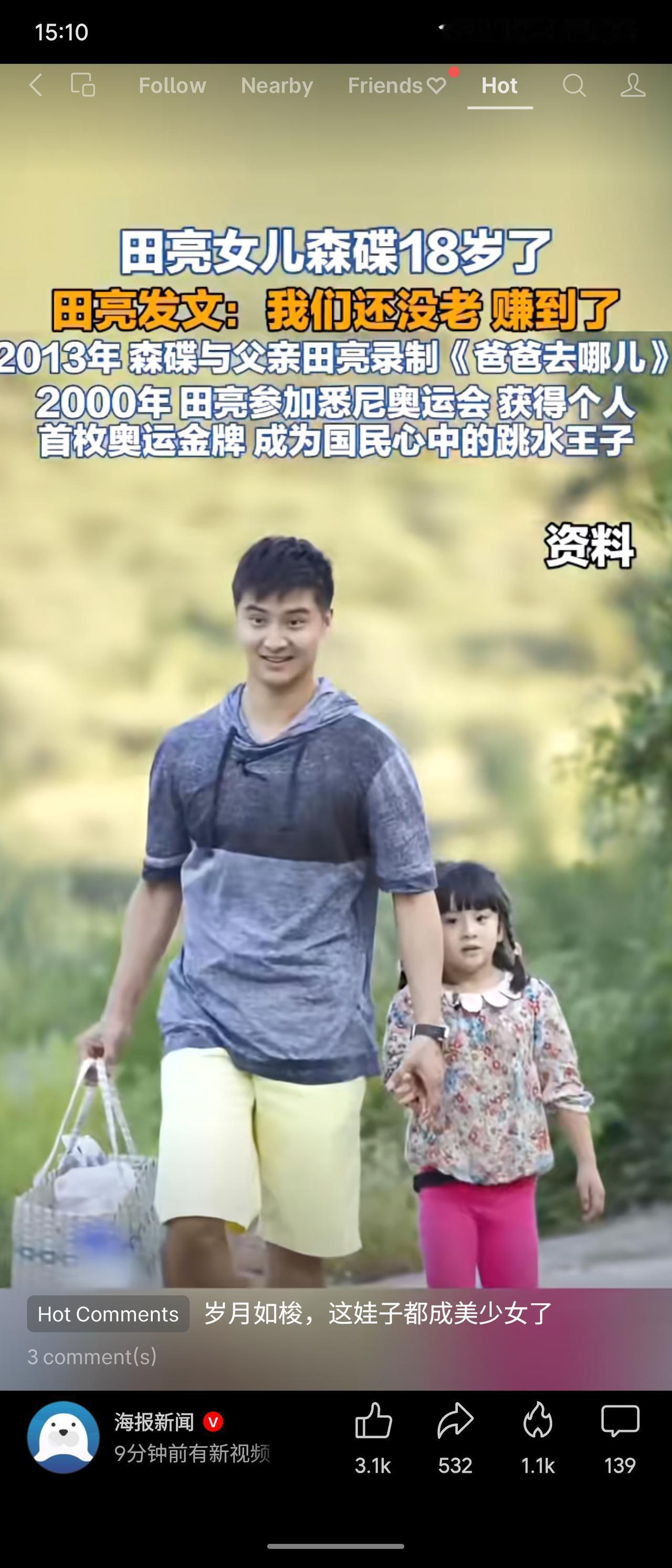 田亮女儿森碟18岁生日,田亮发文感叹“我们还没老,赚到了”。从《爸爸去哪儿》的小