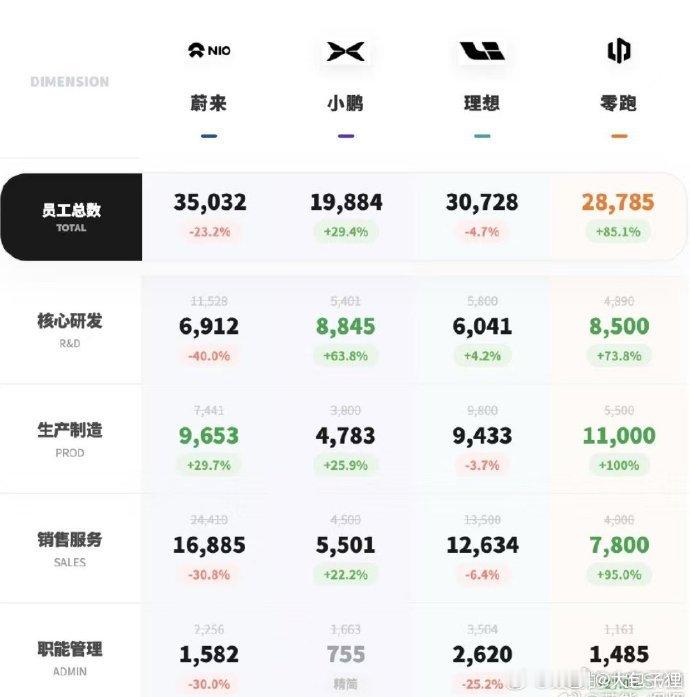 最后,我们退一万步说,即便是小跑老师这个“人多力量大”的逻辑存在,那我们看到它这个表格中划线的过去数字也很矛盾,同样是研发人数,蔚来、理想在过去都远高于小鹏,难道是说在以前的时间段里,小鹏的产品中科技的含量最少么?答案显然也不是这样的。