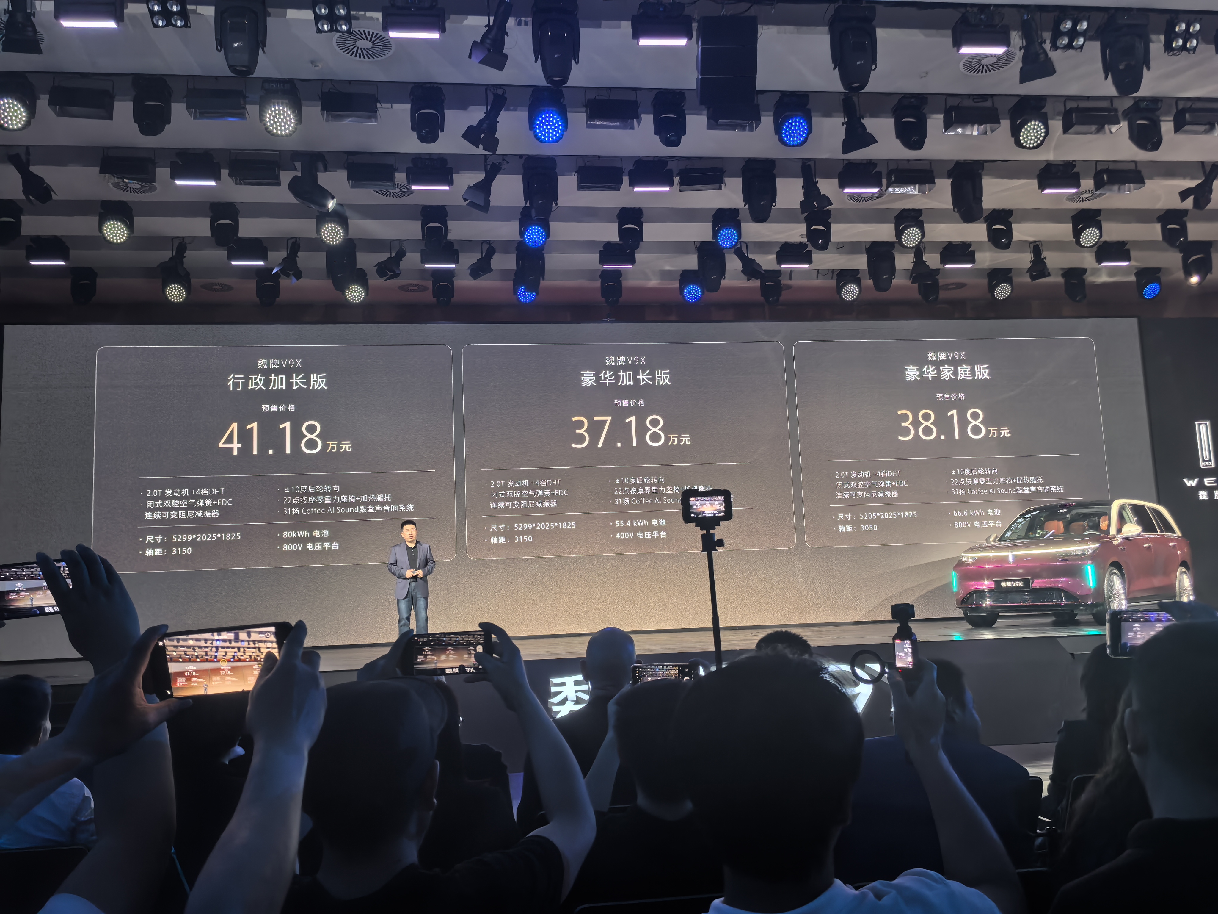 4月17日,魏牌以“契约”为主题发布归元S技术平台及首款旗舰车型魏牌V9X,预售价37.18万元起。归元S平台秉持“回归造车本源”理念,兼容燃油、混动、插混、纯电、氢能五种动力形式,并支持轴距灵活调整。核心技术包括:超级Hi4(4.6秒零百加速,馈电4.8秒,WLTC馈电油耗6.3L)、超级智慧底盘(双腔空悬+后轮转向,转弯半径<5米)、原生AI舱驾智能体(双VLA大模型)。魏牌V9X提供家庭版与加长版,车长5.2-5.3米,六座布局,二排零重力座椅带按摩,21.4英寸吸顶屏+31扬声器音响,车身88%高强钢,支持160km/h爆胎稳控。长城董事长魏建军强调“去伪存真”,以安全品质为最高契约。