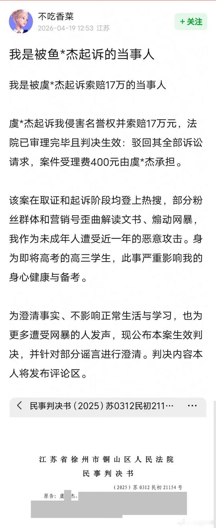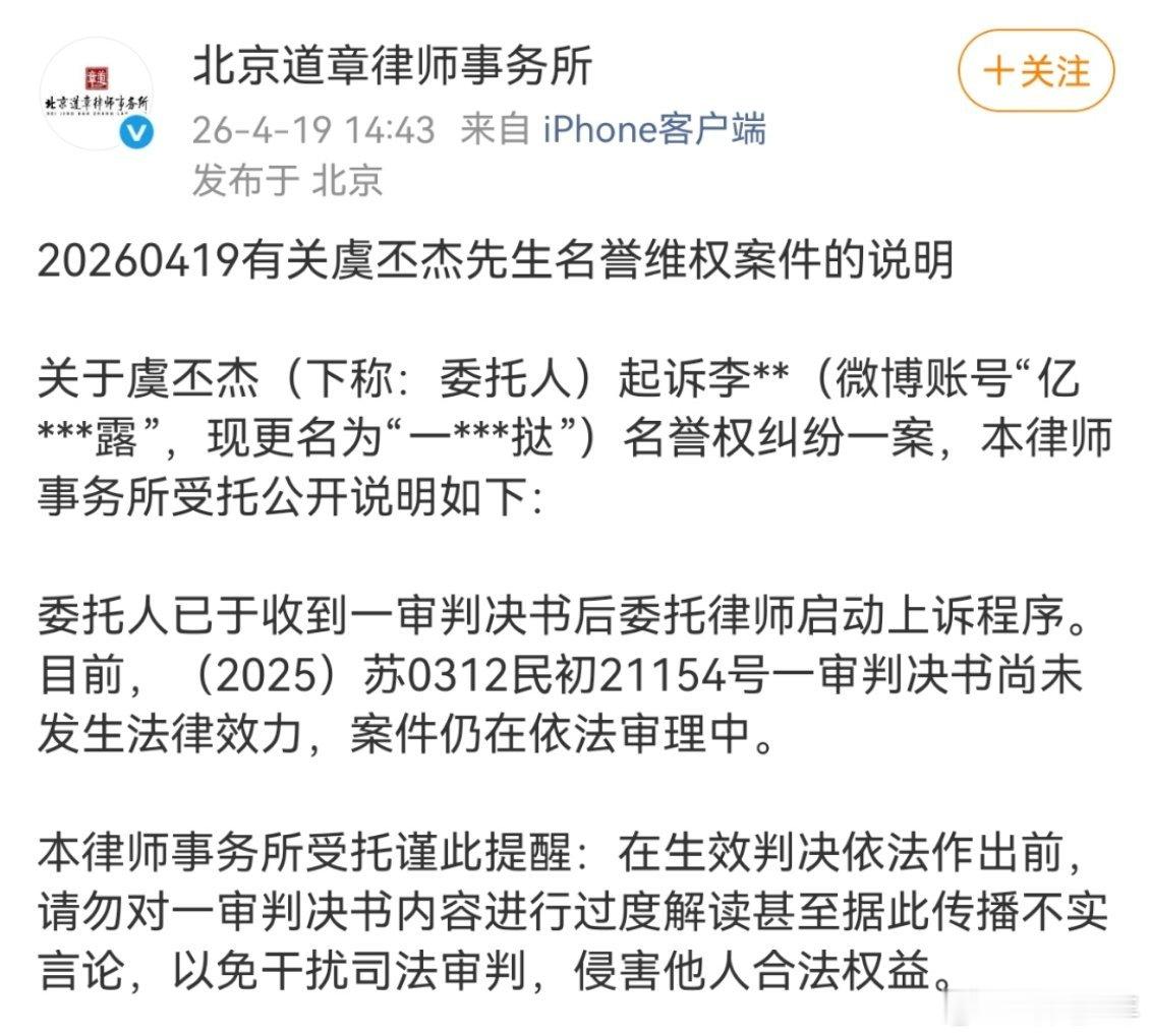 虞书欣父亲案件仍在依法审理中虞书欣父亲名誉维权案件的说明虞书欣父亲索赔17w败诉