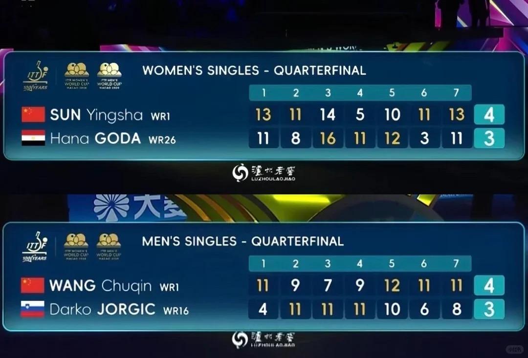 澳门世界杯最惊魂的两场比赛,就属1/4决赛,莎莎和汉娜.高达,王楚钦和达科这两场了吧!