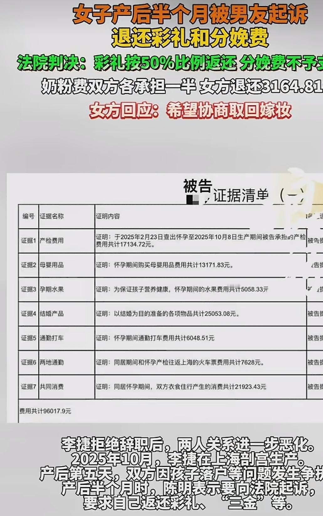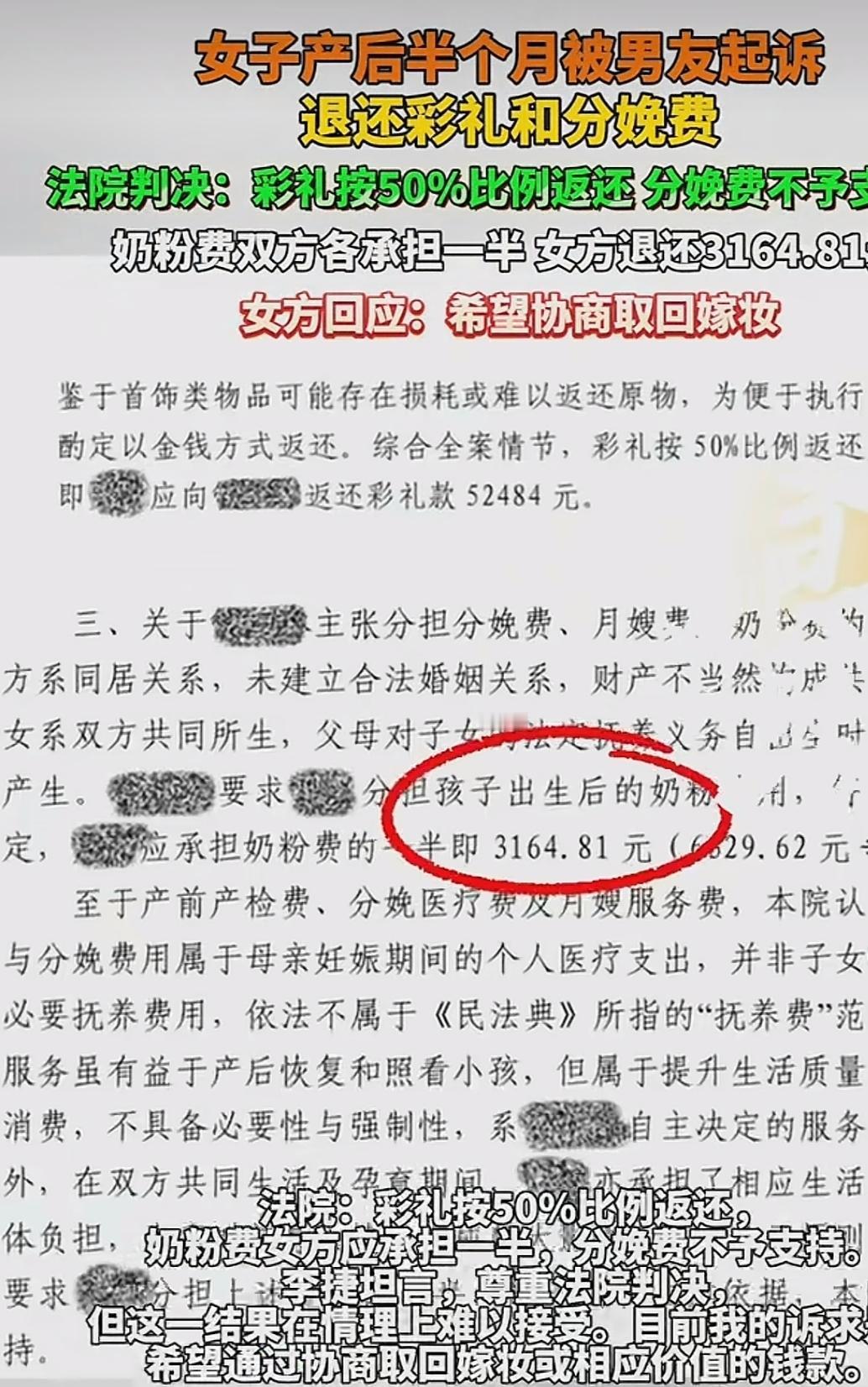 最终法院根据实际情况作出判决,驳回了男子要求全额退还彩礼、分摊分娩费的诉求,只让女子返还了部分彩礼,奶粉钱则判定由双方共同承担,但不支持分娩费。