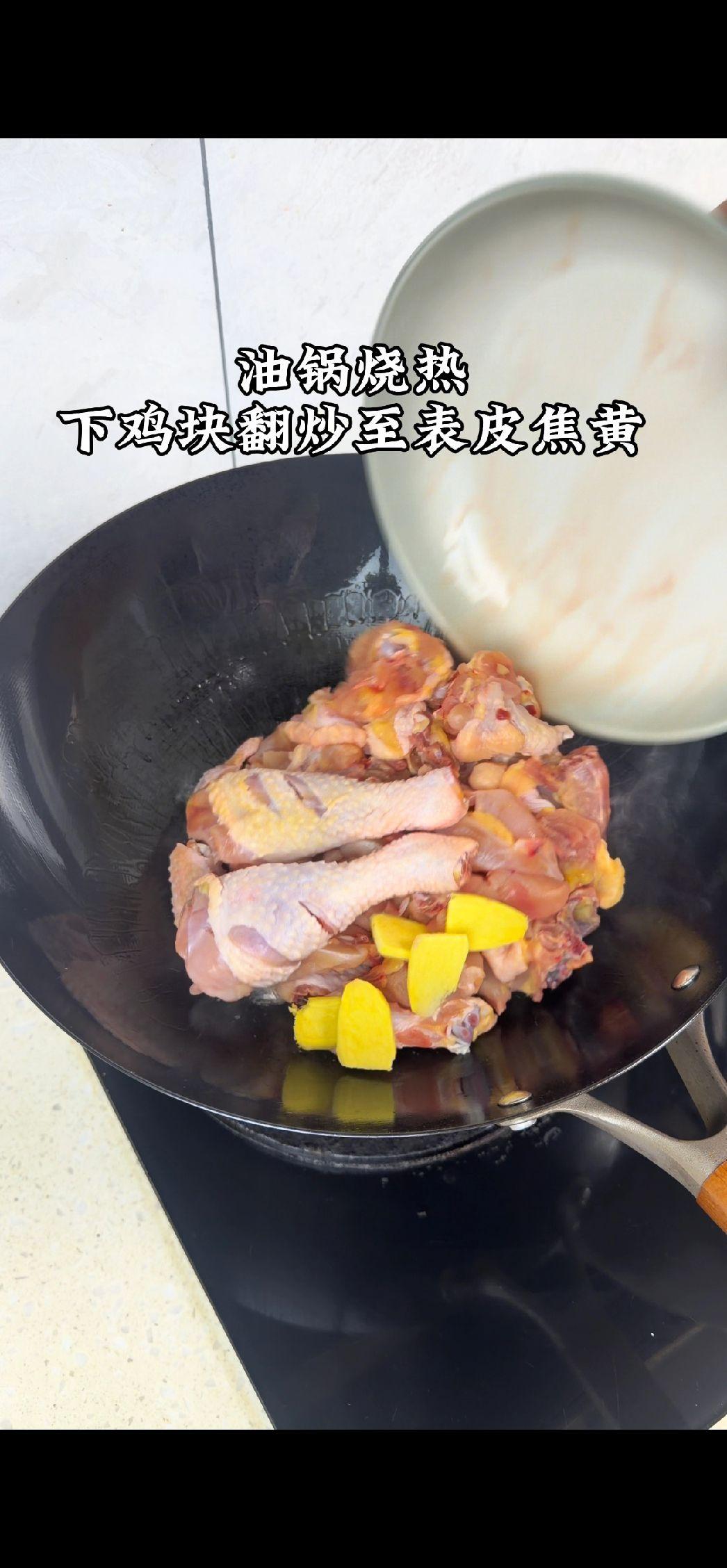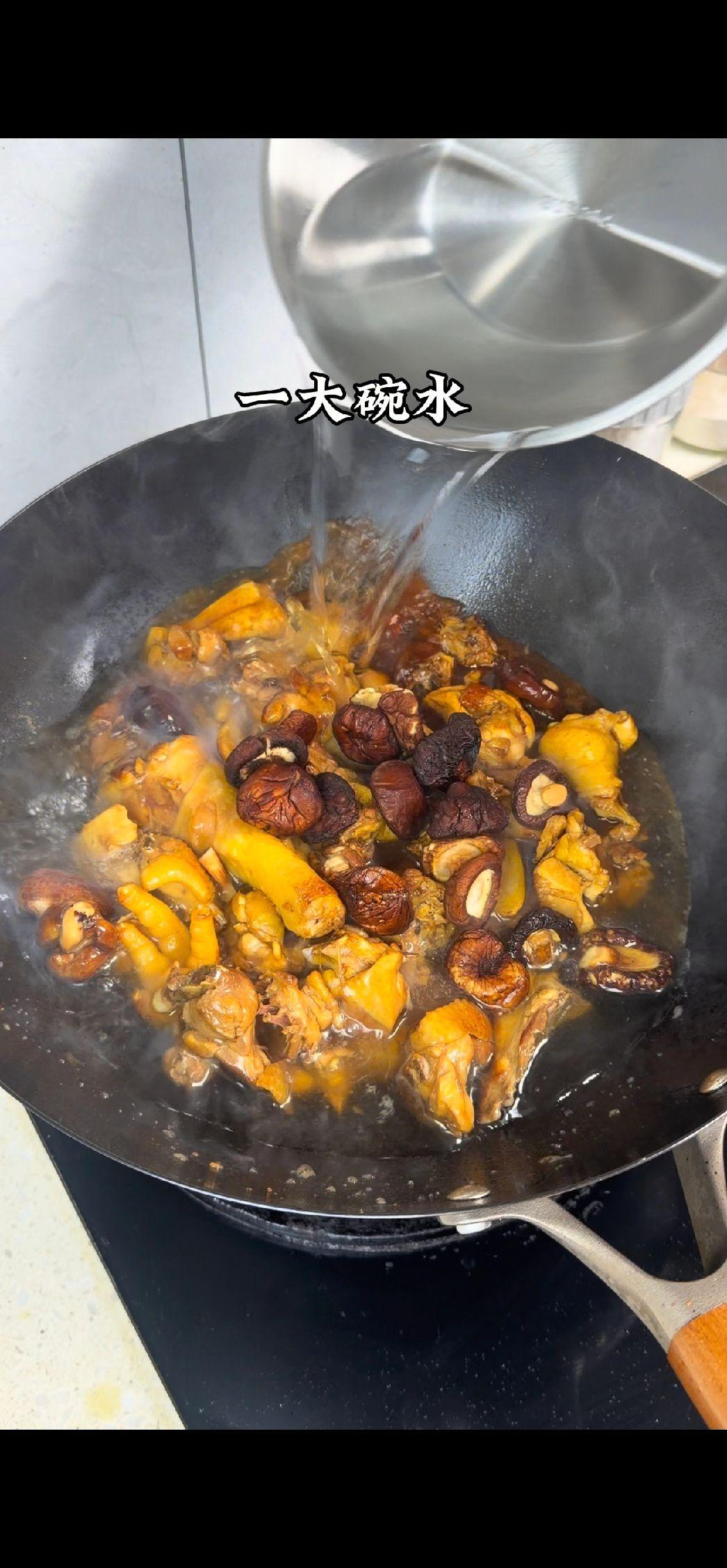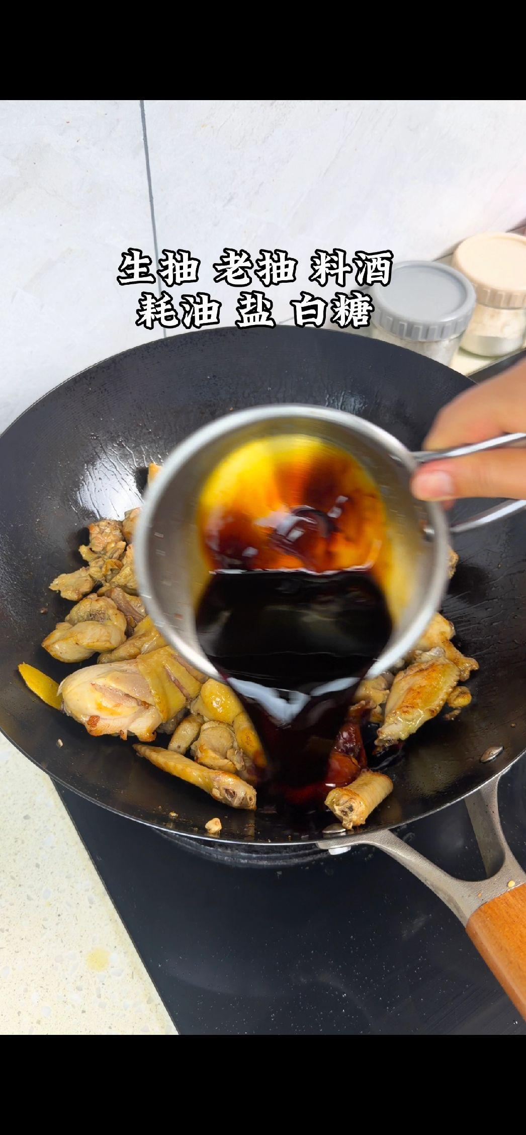 2️⃣炒制:锅中热油,放入鸡块翻炒至表皮焦黄,加入生抽、老抽、料酒、蚝油、盐、白糖调味翻炒均匀,再放入香菇一起炒香。