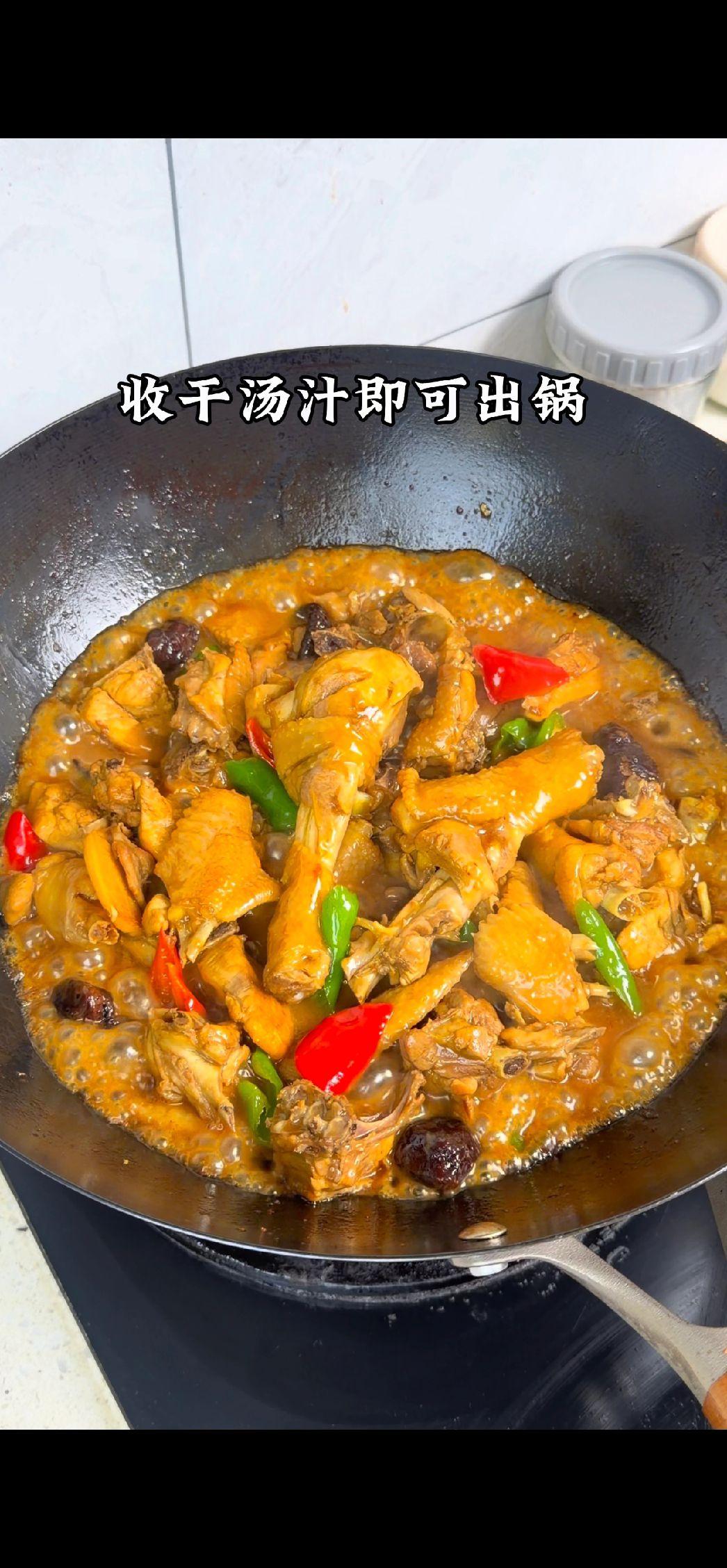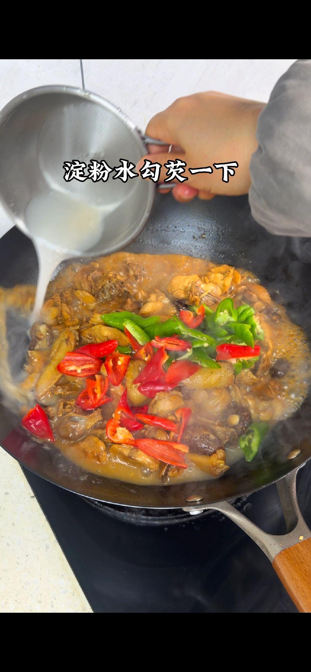 3️⃣炖煮:加入大半碗水,炖煮20分钟。出锅前倒入青红辣椒和淀粉水勾芡,翻炒均匀收汁即可。