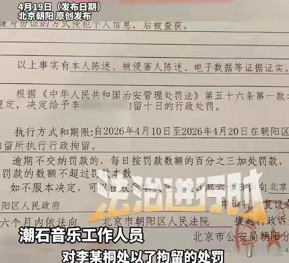 4月19日,据法治进行时报道,李某桐已被北京朝阳分局依法行政拘留十日的处罚。