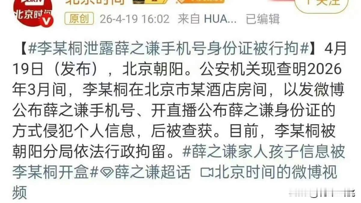据相关报道称,2026年3月间,薛之谦前女友李某桐在北京一酒店的房间内,发微博公布薛之谦的手机号码,然后还开直播公布薛之谦身份证号码。