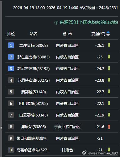 【内蒙古断崖式降温】今天因为冷空气影响,内蒙古中部以及甘肃、宁夏局地降温超20℃。今天14时对比昨天14时,内蒙古二连浩特降26.1℃、那仁宝力格降25℃、苏尼特左旗降24.7℃,苏尼特右旗降23.8℃、满都拉降22.7℃、阿巴嘎旗降22.1℃、白云鄂博降21.9℃。宁夏海原降21.6℃、甘肃乌鞘岭降21℃。