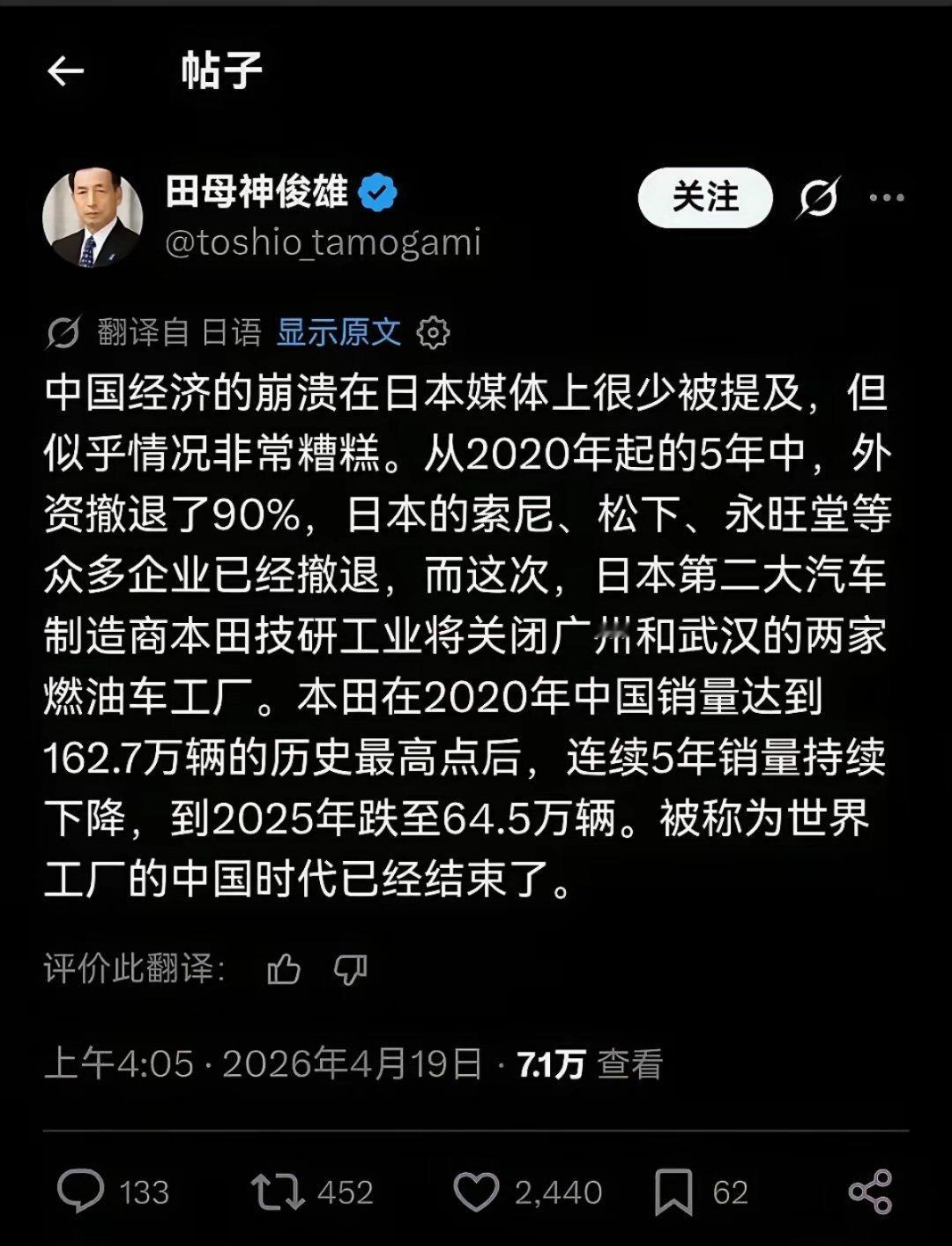 日本极右翼分子田母神俊雄:“索尼、松下、永旺堂等众多日本企业从中国撤出,说明中国经济崩溃了,本田关闭广州和武汉的两家燃油车工厂,销量跌至年64.5万辆,说明中国的世界工厂地位结束了。”